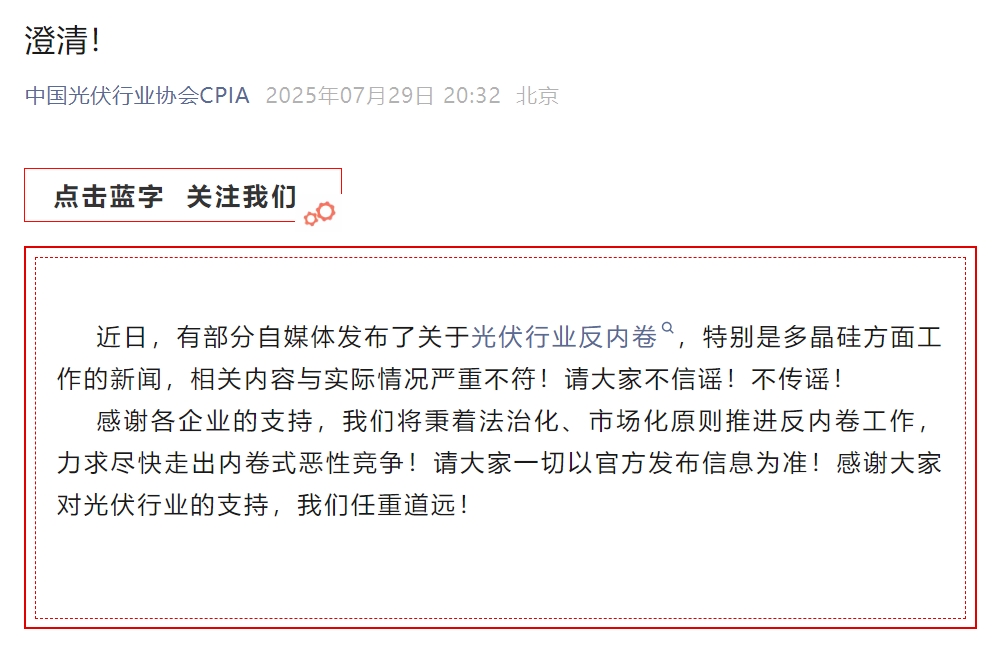 中国光伏行业协会:澄清行业反内卷及多晶硅方面