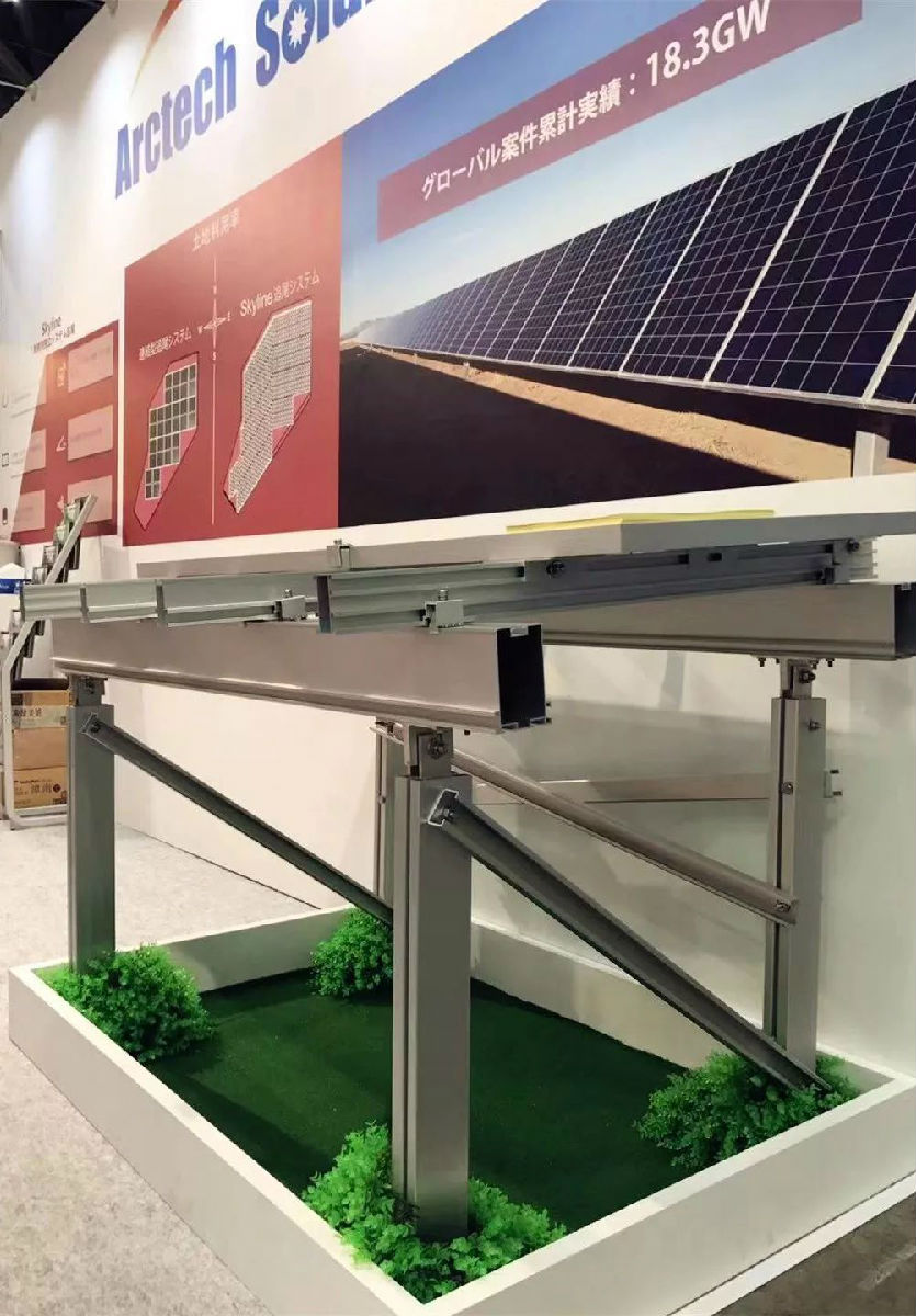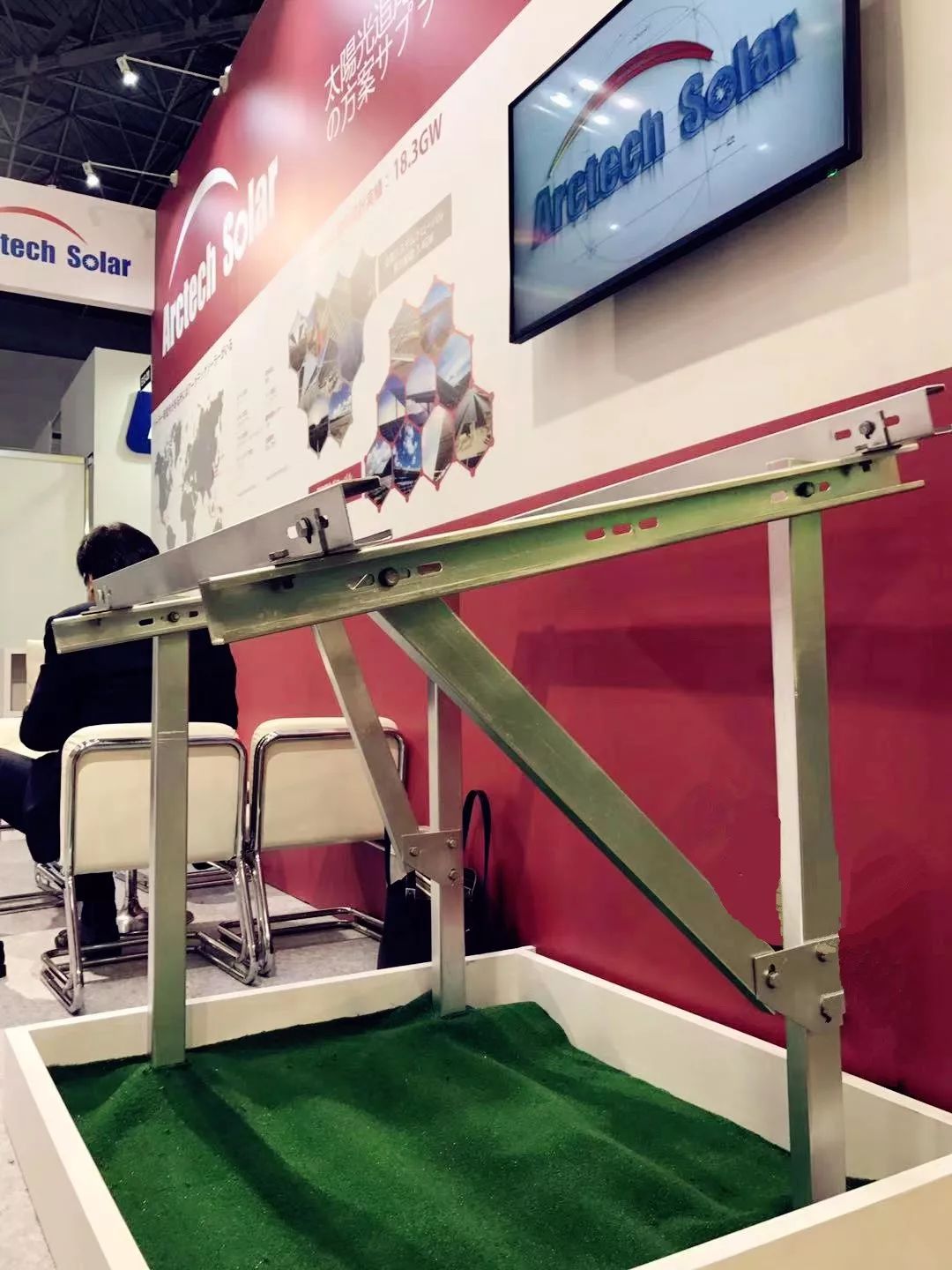 日本地处沿海地区,气候环境多样,对整个光伏产品的抗盐碱、抗湿热及抗高寒性能提出了更为严苛的要求。针对于此,中信博也进一步针对日本市场在技术和产品种类上进行拓展,在此次展会上特别展出新型全铝支架(上图)和常规热镀锌支架(下图)两种不同材质的固定支架,以满足当地不同项目所在地形条件和自然环境的实际需求。展会期间,得到了众多日本客户驻足了解。