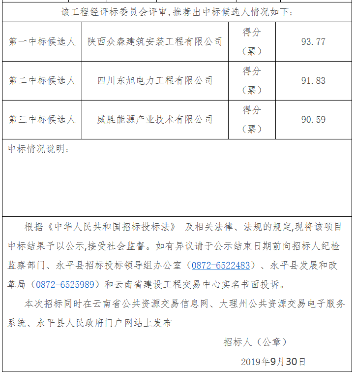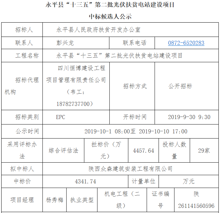 10月8日,云南省永平县“十三五”第二批光伏扶贫电站建设项目中标候选人公示。陕西众森建筑安装有限公司以总报价43417400元、单价6.12元/瓦拟中标人。中标公示原文如下: