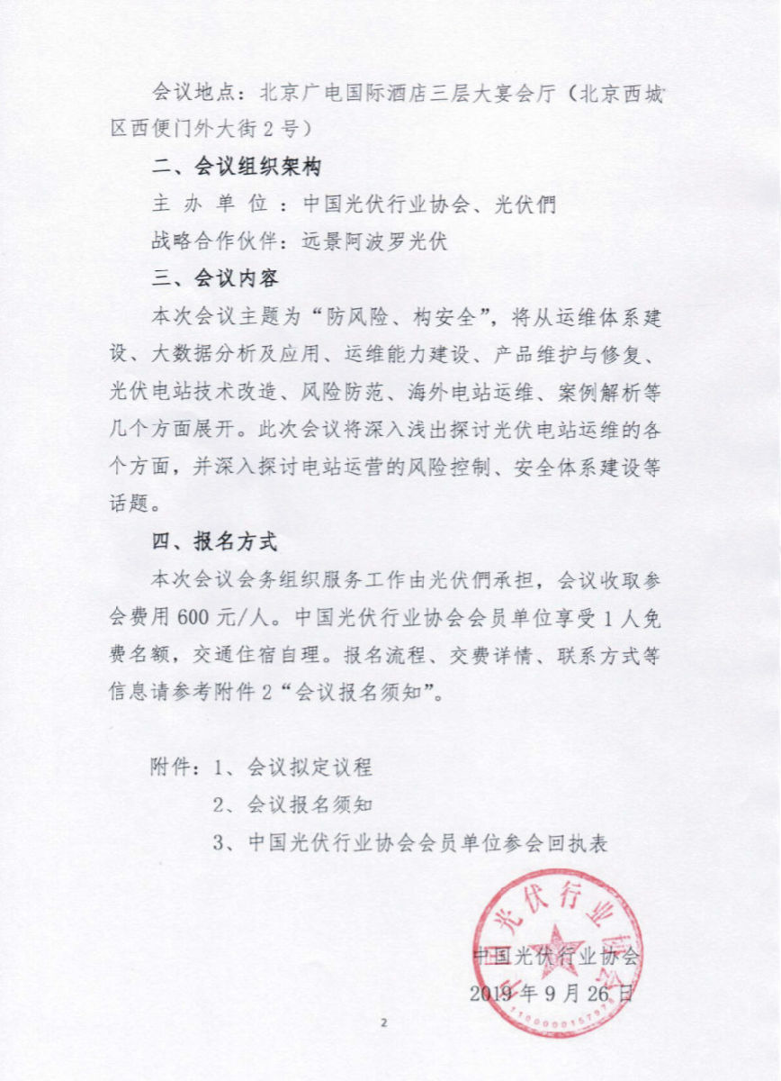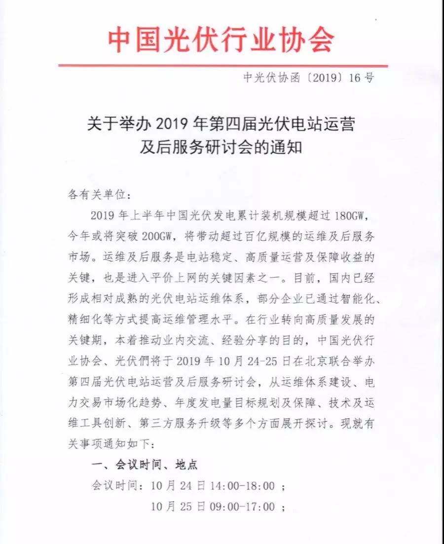运维及后服务是电站稳定、高质量运营及保障收益的关键,也是进入平价上网的关键因素之一。由中国光伏行业协会、光伏們联合主办的2019年第四届光伏电站运营及后服务研讨会将于10月24-25日在北京举办,从运维体系建设、电力交易市场化趋势、年度发电量目标规划及保障、技术及运维工具创新等多个方面展开探讨。