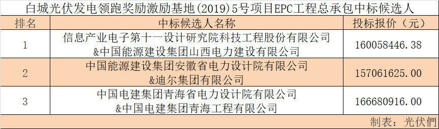 信息产业电子第十一设计研究院科技工程股份有限公司&中国能源建设集团山西电力建设有限公司的联合体,以16005.844638万元的总报价、单价1.6元/瓦位列EPC工程总承包第一中标候选人;山西联能建设工程项目管理有限公司以85万元的总报价,单价0.0085元/瓦位列施工监理第一中标候选人。中标候选人详情如下: