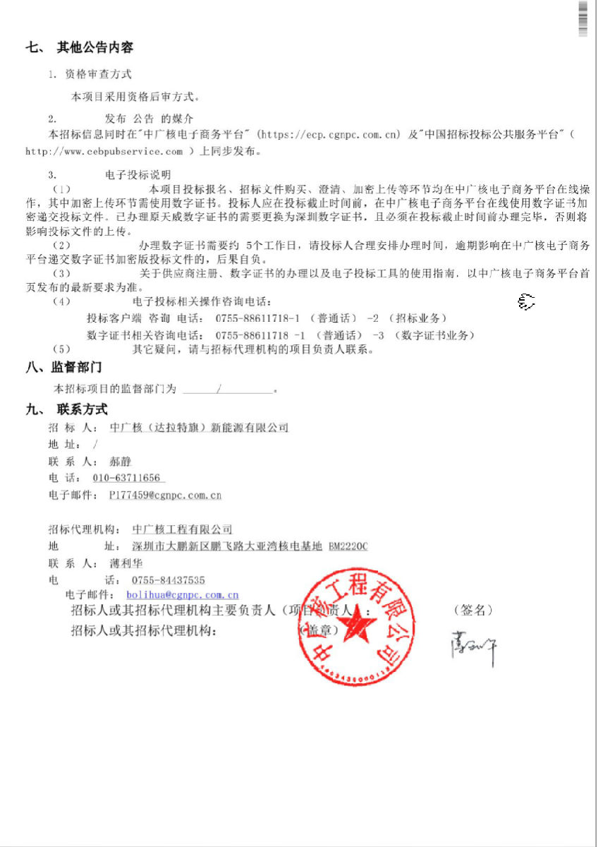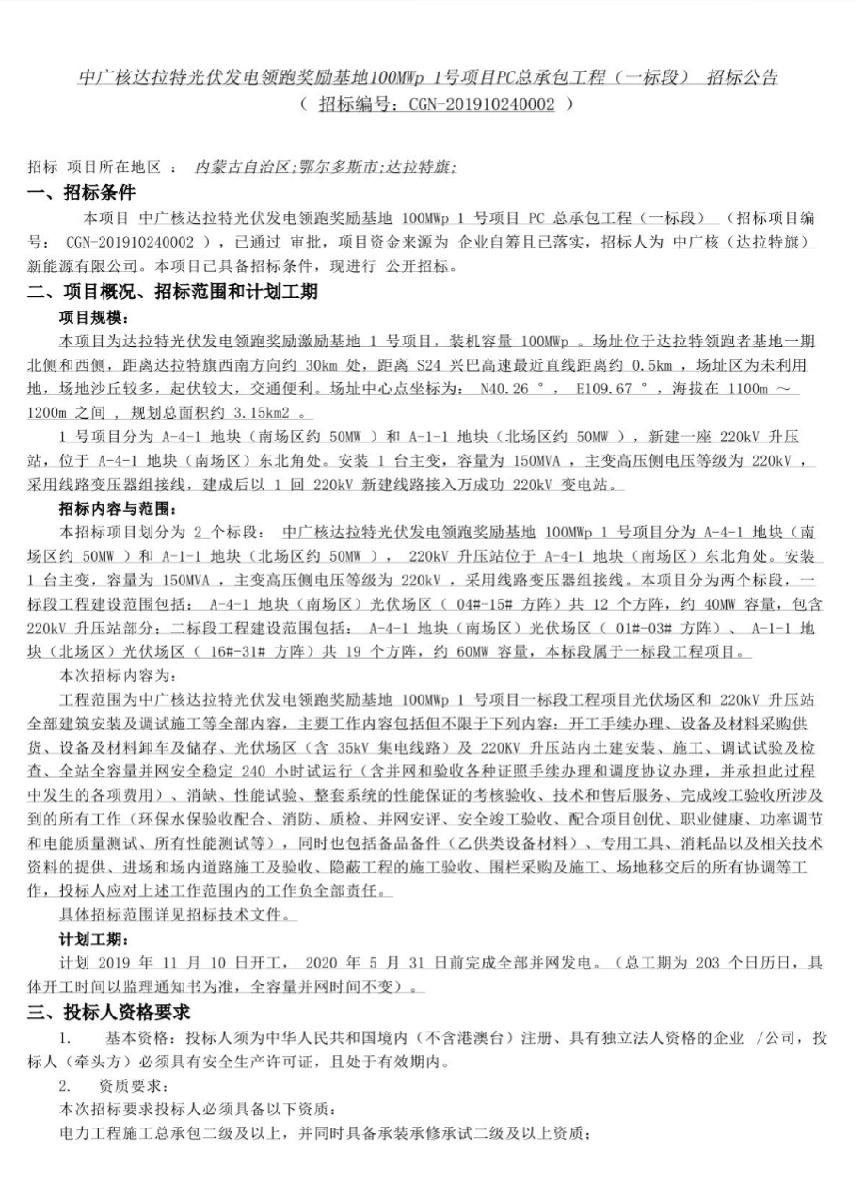 10月24日,中广核发布达拉特领跑者奖励基地100MW项目EPC总承包工程(一标段)招标公告,项目共分为两个标段,此次招标内容为一标段工程项目,建设范围包括A-4-1地块(南场区)光伏场区(04#-15#方阵)共12个方阵,约40MW容量,包含220kV光伏场区。