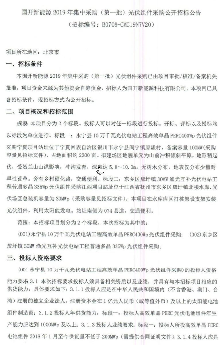 近日,国开新能源2019年集中采购(第一批)光伏组件采购公开招标公告发布。