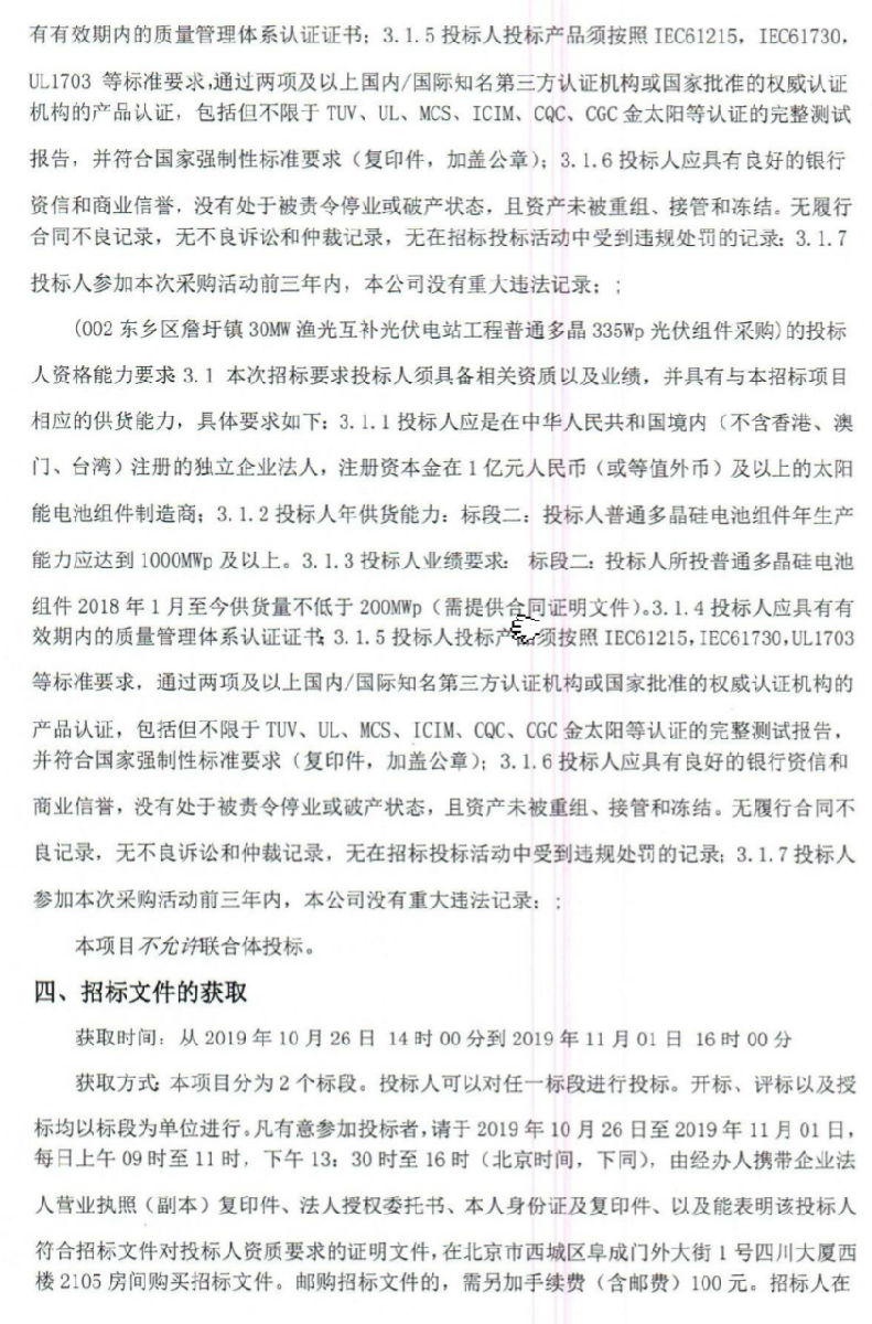 本次招标项目包括两个,分别是永宁县10万千瓦光伏电站工程高效单晶PERC400Wp光伏组件采购和东乡区詹圩镇30MW渔光互补光伏电站工程普通多晶335Wp光伏组件采购。