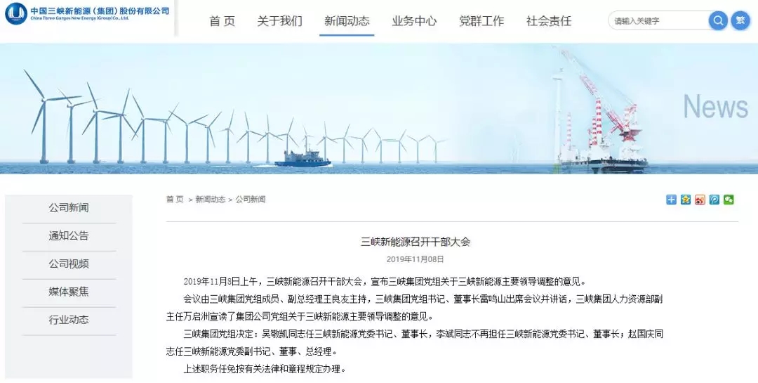 2019年11月8日上午,三峡新能源召开干部大会,宣布三峡集团党组关于三峡新能源主要领导调整的意见。会议由三峡集团党组成员、副总经理王良友主持,三峡集团党组书记、董事长雷鸣山出席会议并讲话,三峡集团人力资源部副主任万启洲宣读了集团公司党组关于三峡新能源主要领导调整的意见。