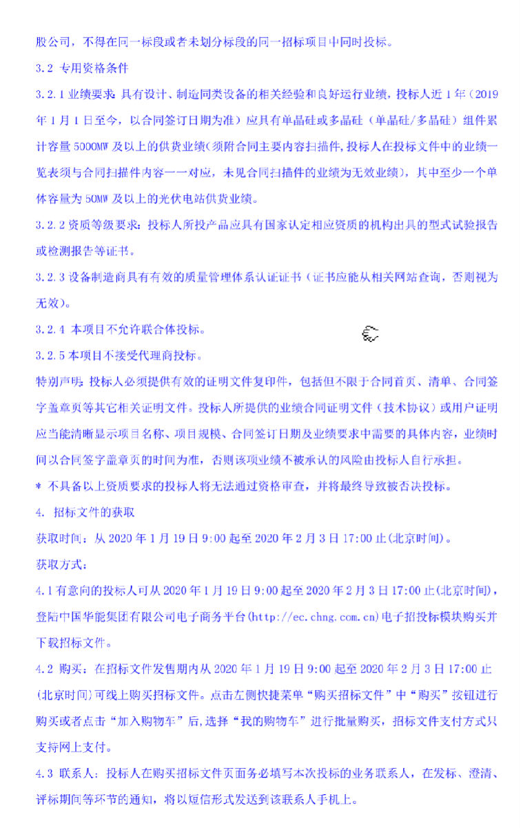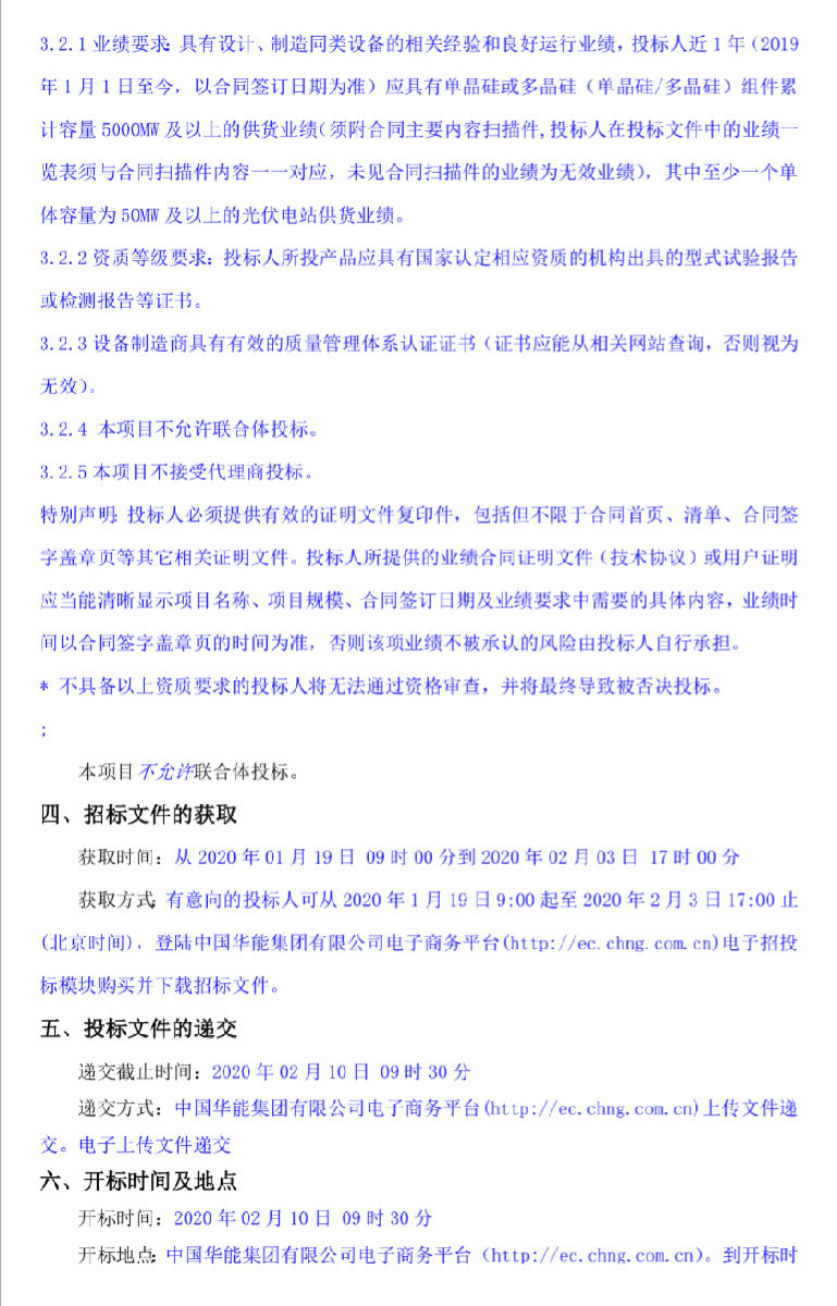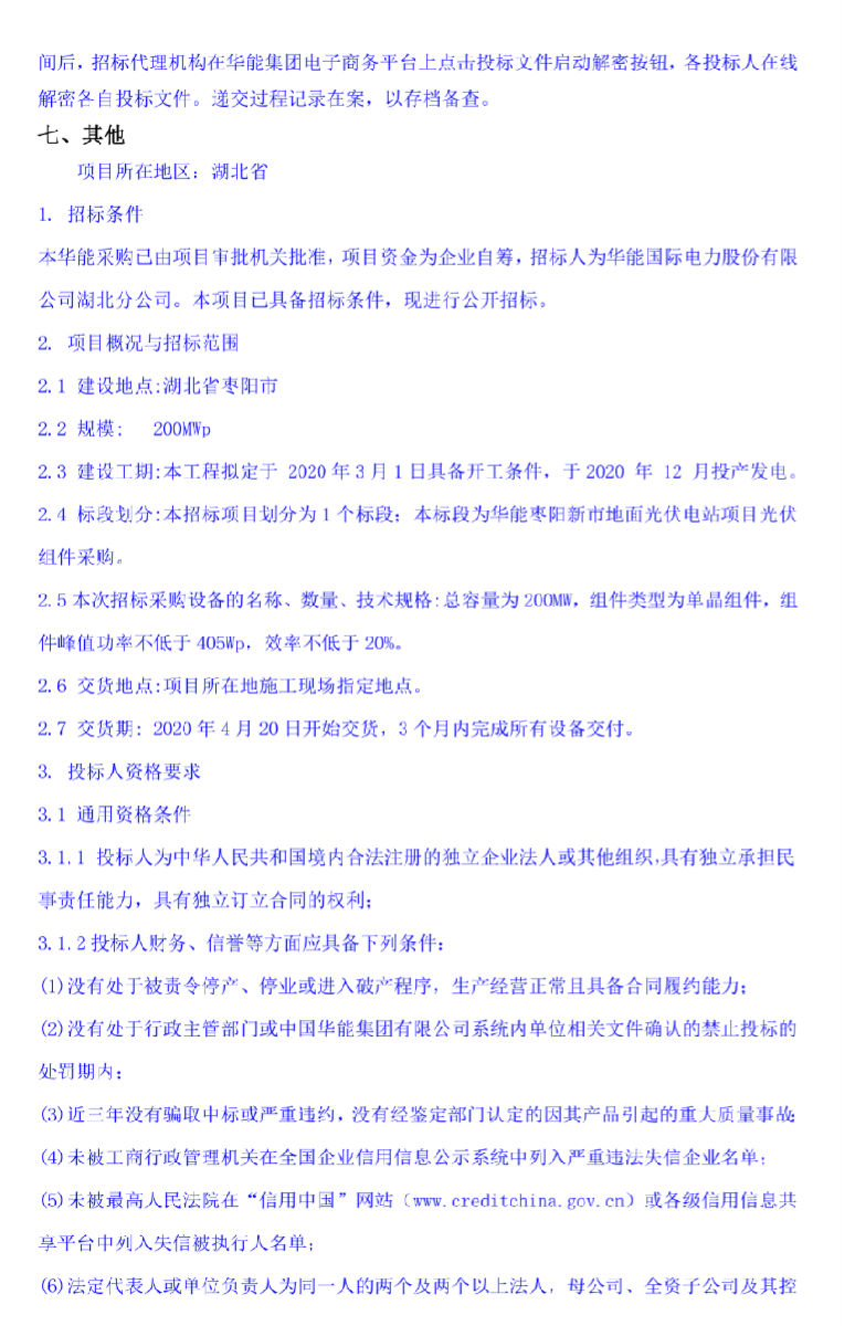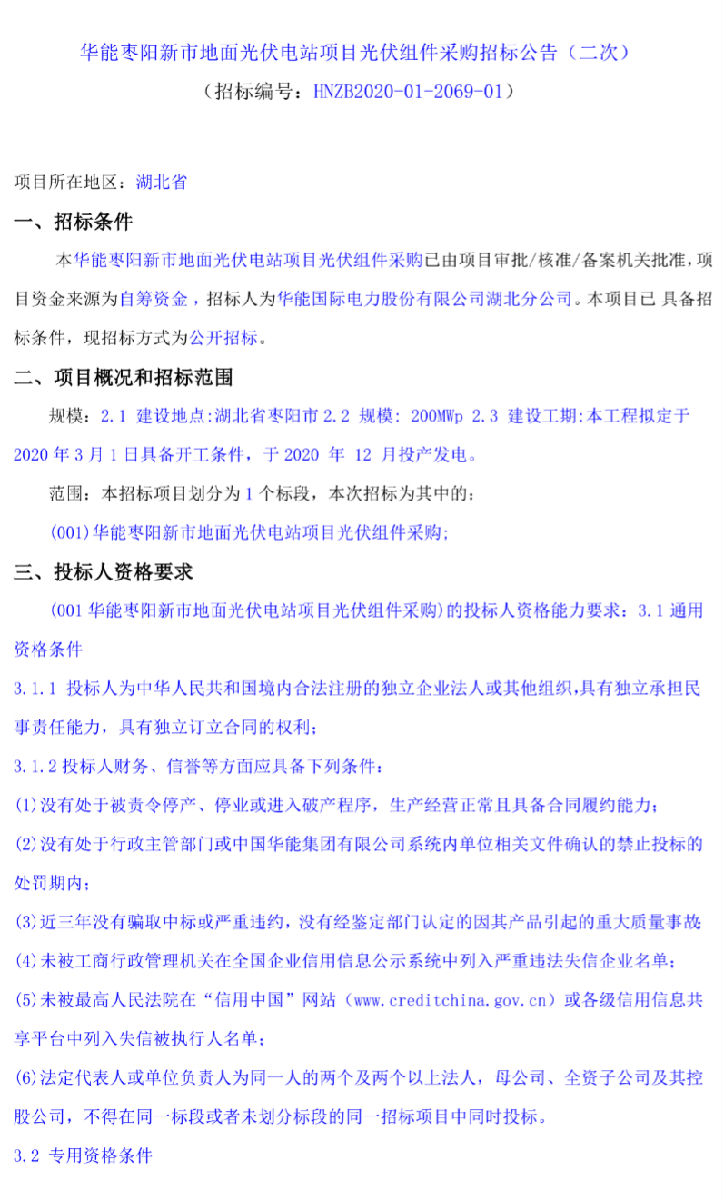 1月17日,华能枣阳新市地面光伏电站项目光伏组件采购招标公告(二次)发布。