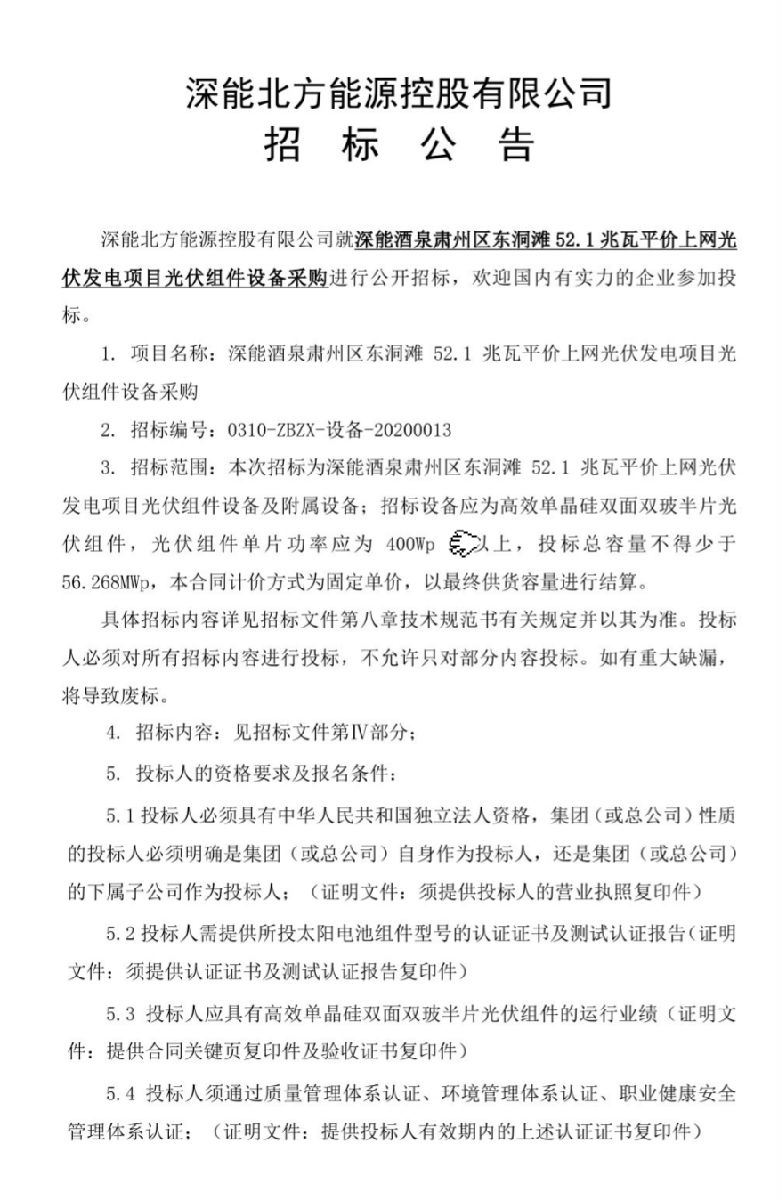 2月11日,深能酒泉肃州区东洞滩52.1兆瓦平价上网光伏发电项目光伏组件设备采购招标公告发布。