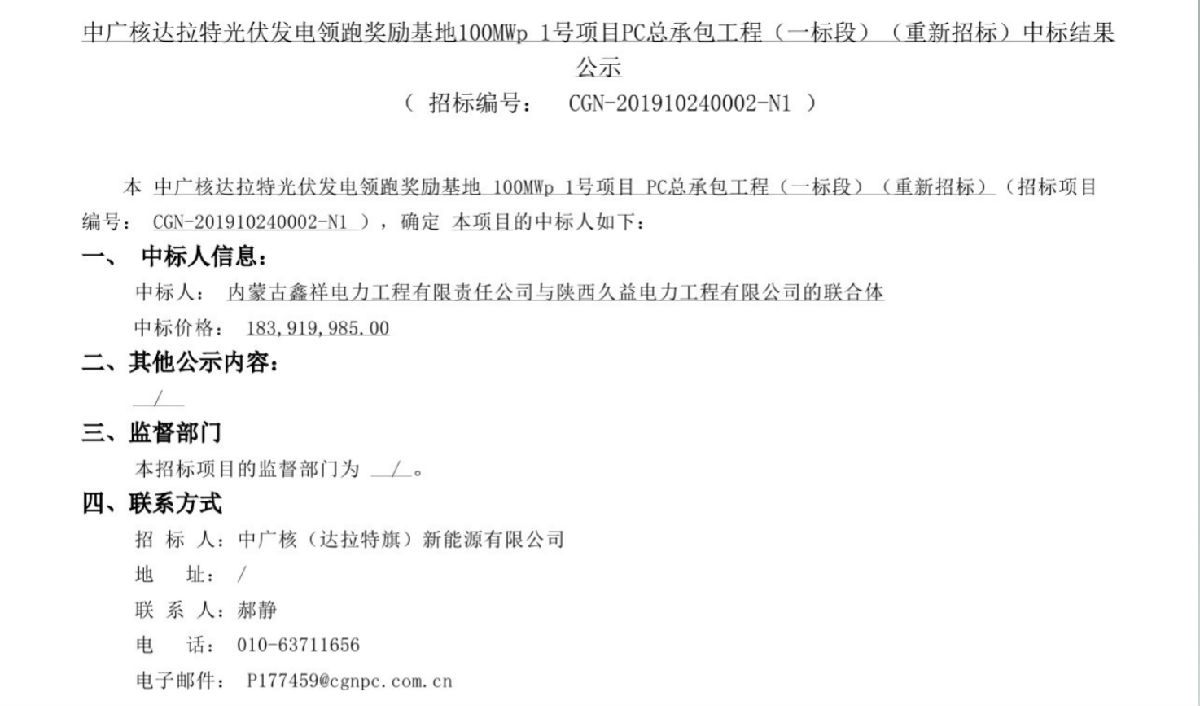 2月20日,中广核达拉特光伏发电领跑奖励基地100MWp 1号项目PC总承包工程(一标段)(重新招标)中标结果公示。内蒙古鑫祥电力工程有限责任公司与陕西久益电力工程有限公司的联合体以183919985元的总报价,单价4.589元/瓦中标。