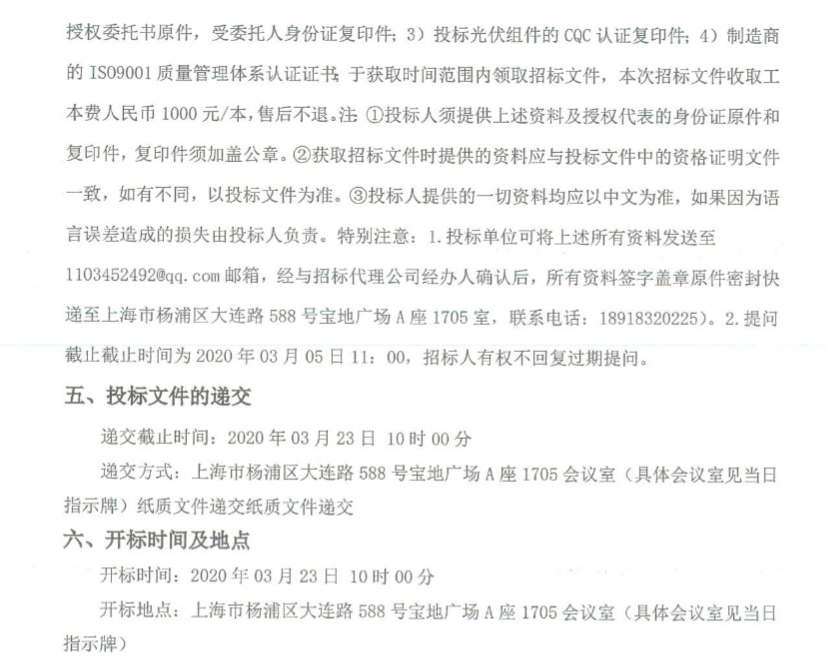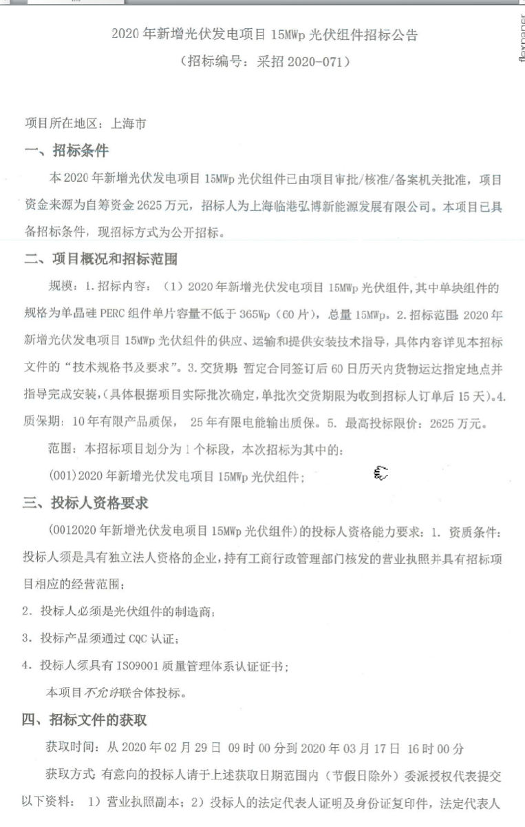 2月28日,上海临港弘博新能源发展有限公司2020年新增光伏发电项目15MWp光伏组件招标公告发布。