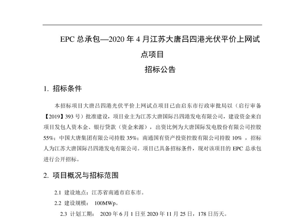 2020年3月16日,江苏大唐吕四港光伏平价上网试点项目EPC总承包招标公告发布。