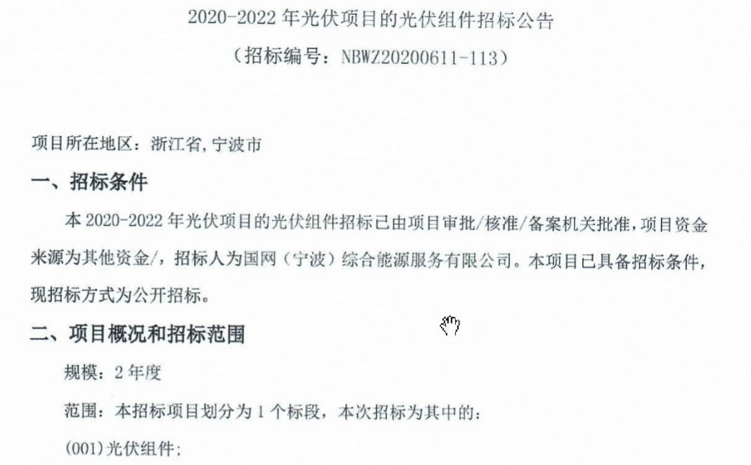 5月21日,国网(宁波)综合能源服务有限公司发布2020-2022年光伏项目的光伏组件招标公告。根据公告,此次组件招标分为薄膜类组件招标和晶硅组件招标。
