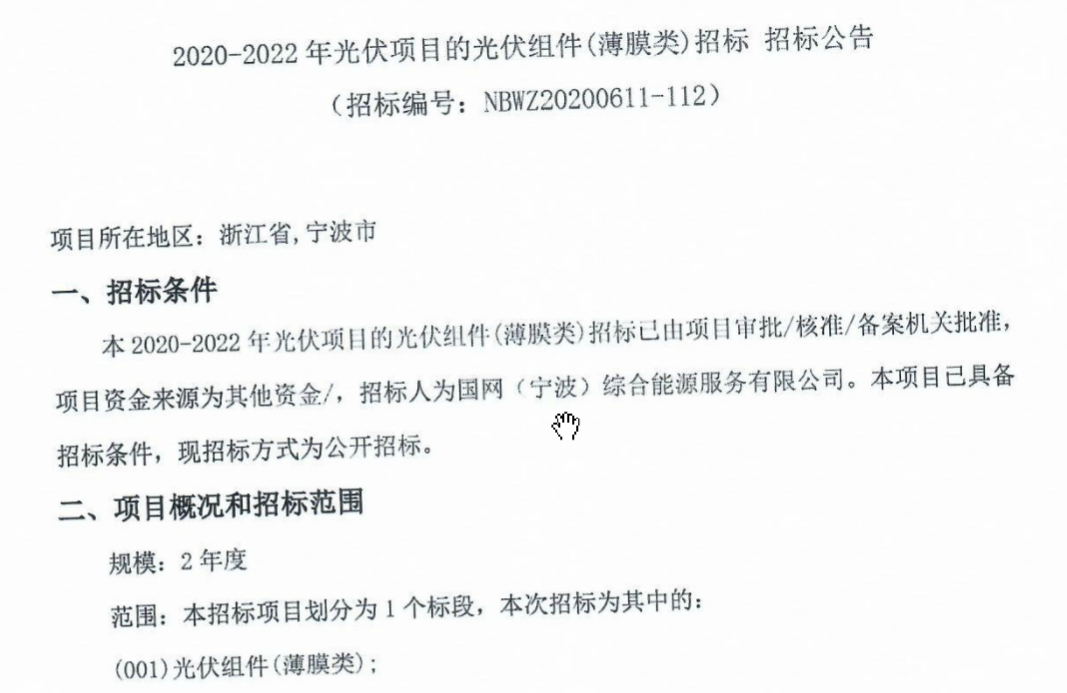 含薄膜组件,国网宁波2020-2022年光伏组件招标公告发布