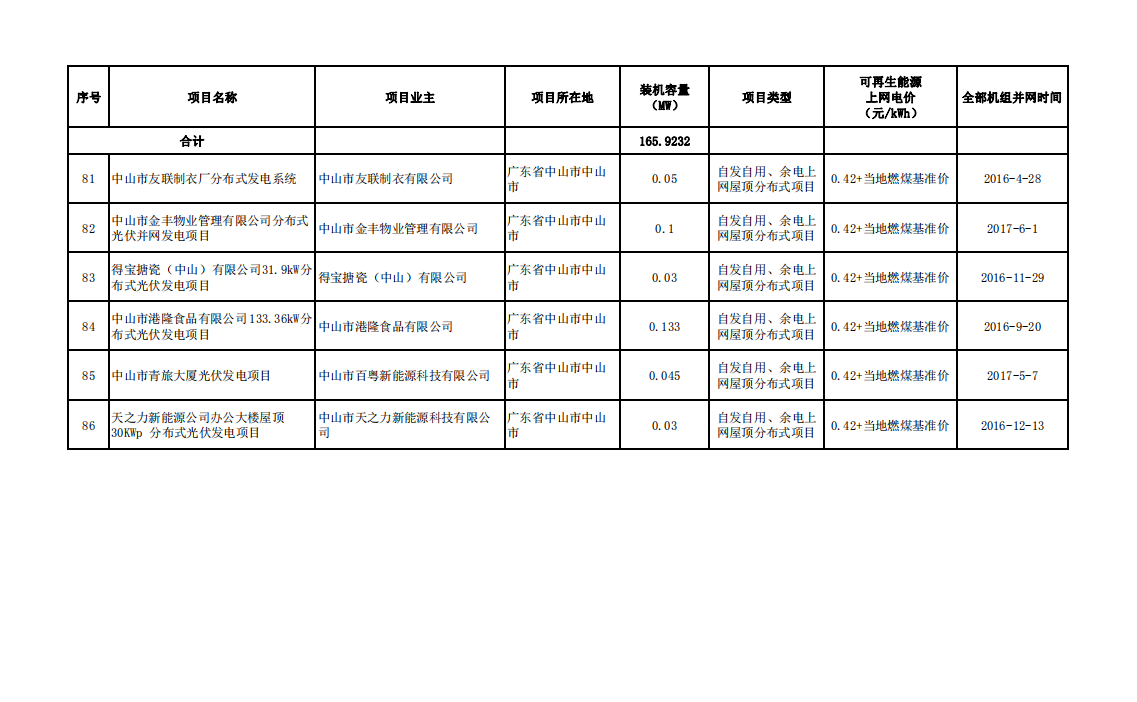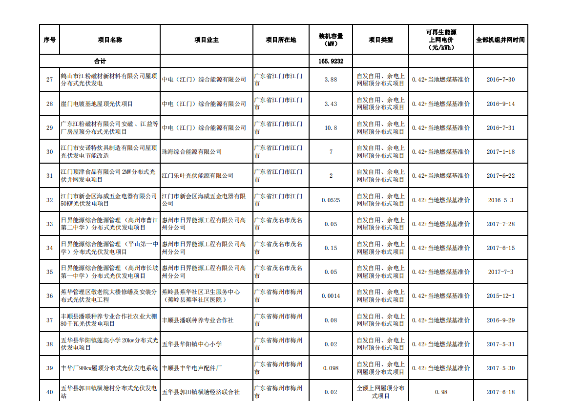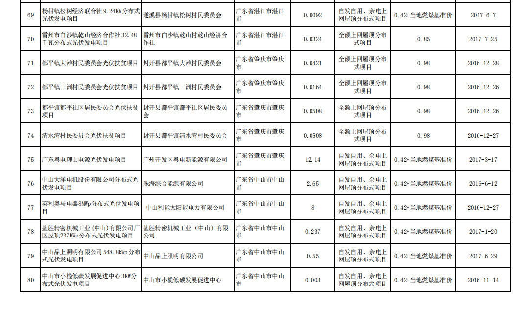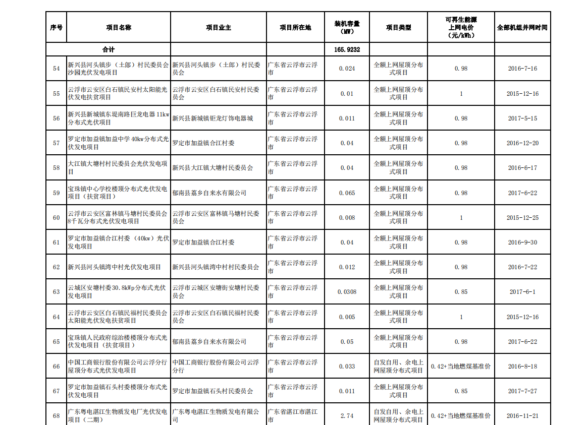 6月2日,广东电网发布关于属地区域内拟纳入2020年可再生能源补贴项目清单(第二阶段)的公示,根据公告,纳入第二阶段可再生能源补贴项目清单的光伏发电项目共计710.4532MW。其中分布式光伏项目有86项,共计165.9232MW。电站项目有14个,共计544.53MW。
