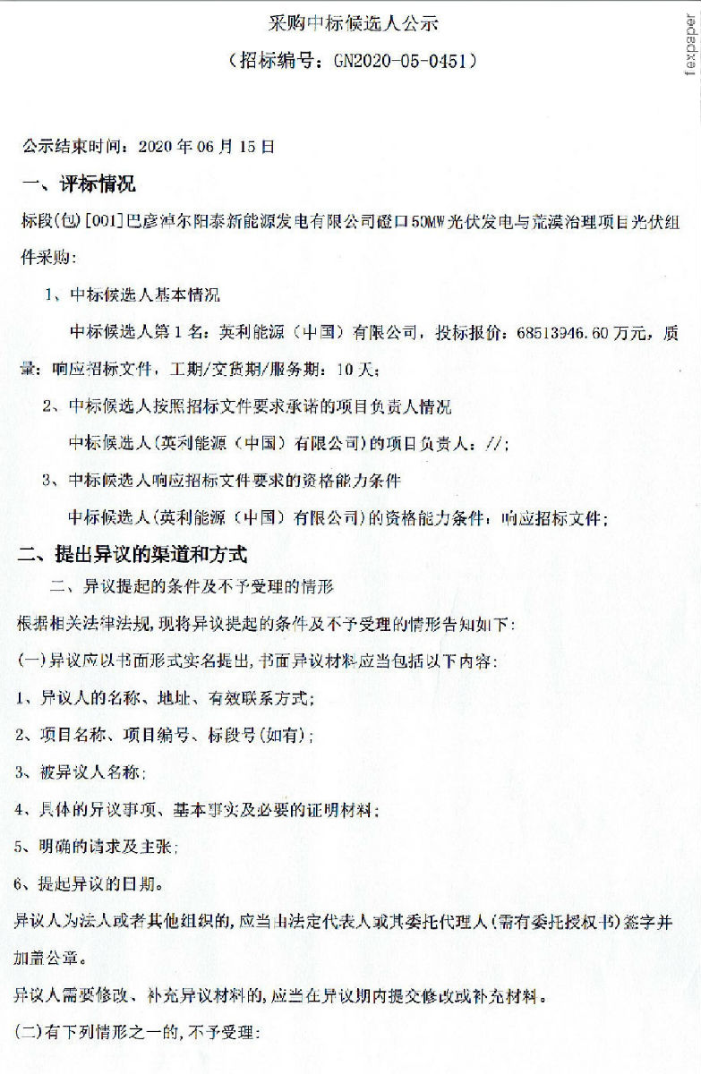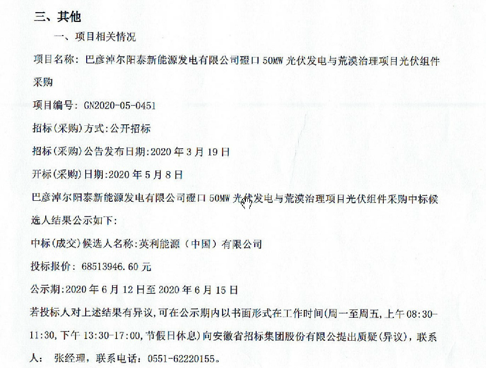 6月12日,巴彦淖尔阳泰新能源发电有限公司磴口50MW光伏发电与荒漠治理项目光伏组件采购中标候选人公示。英利能源(中国)有限公司以68513946.60元的报价位列第一中标候选人。