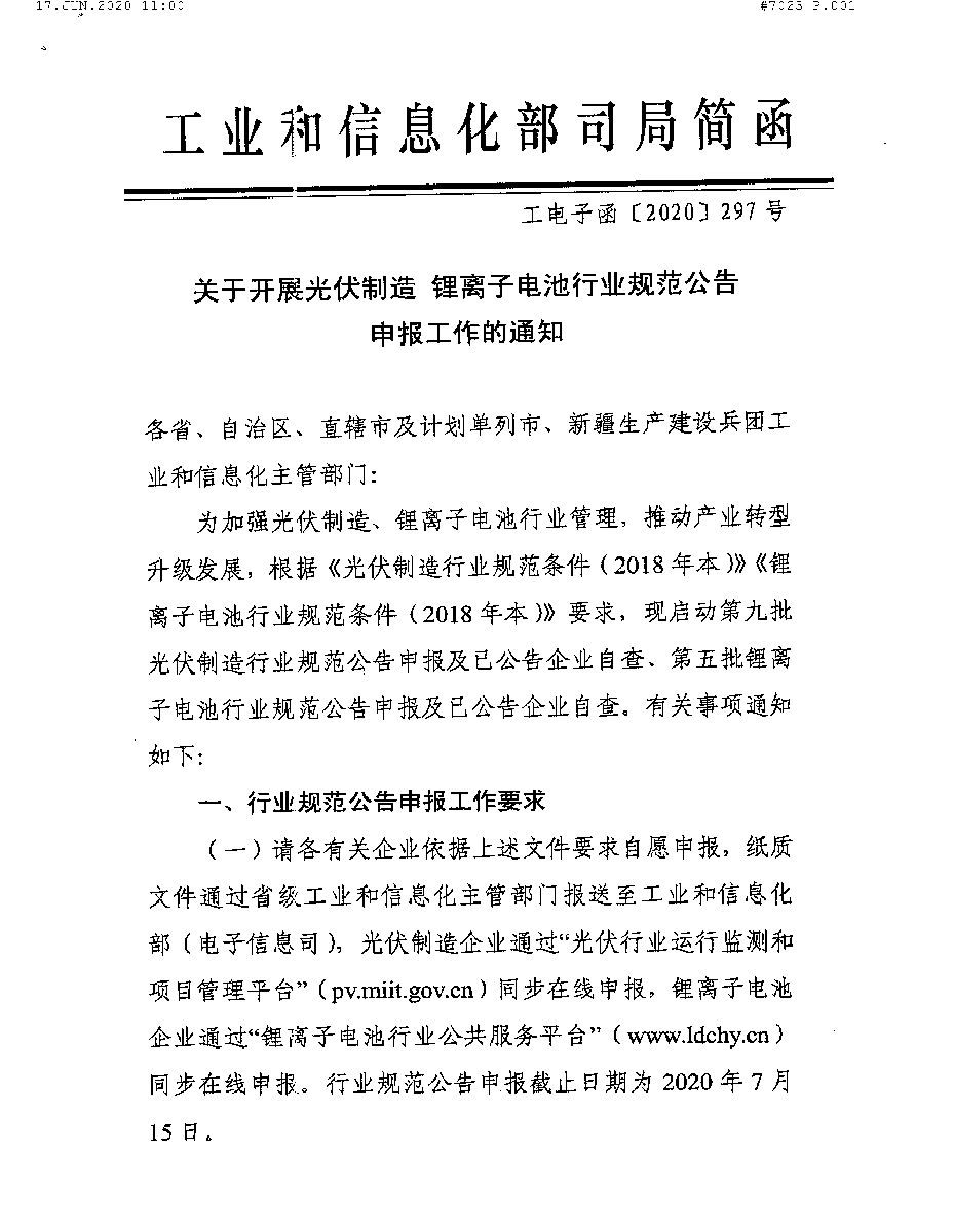 根据工业和信息化部电子信息司《关于开展光伏制造锂离子电池行业规范公告申报工作的通知》(工电子函〔2020〕297号),现就开展光伏制造、锂离子电池行业规范公告申报工作有关事项通知如下: