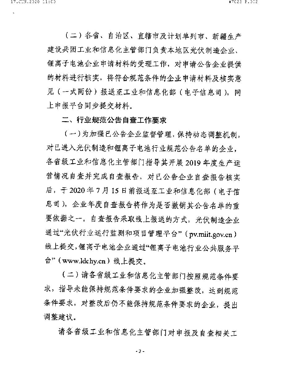 2. 请各地指导本地区已列入光伏制造和锂离子电池行业规范公告名单企业(名单附后)开展2019年生产运营情况自查,将审核后的企业纸质自查报告报送我厅,并通知光伏制造企业和锂离子电池制造企业分别通过 “光伏行业运行监测和项目管理平台”、“锂离子电池行业公共服务平台”同步在线提交。