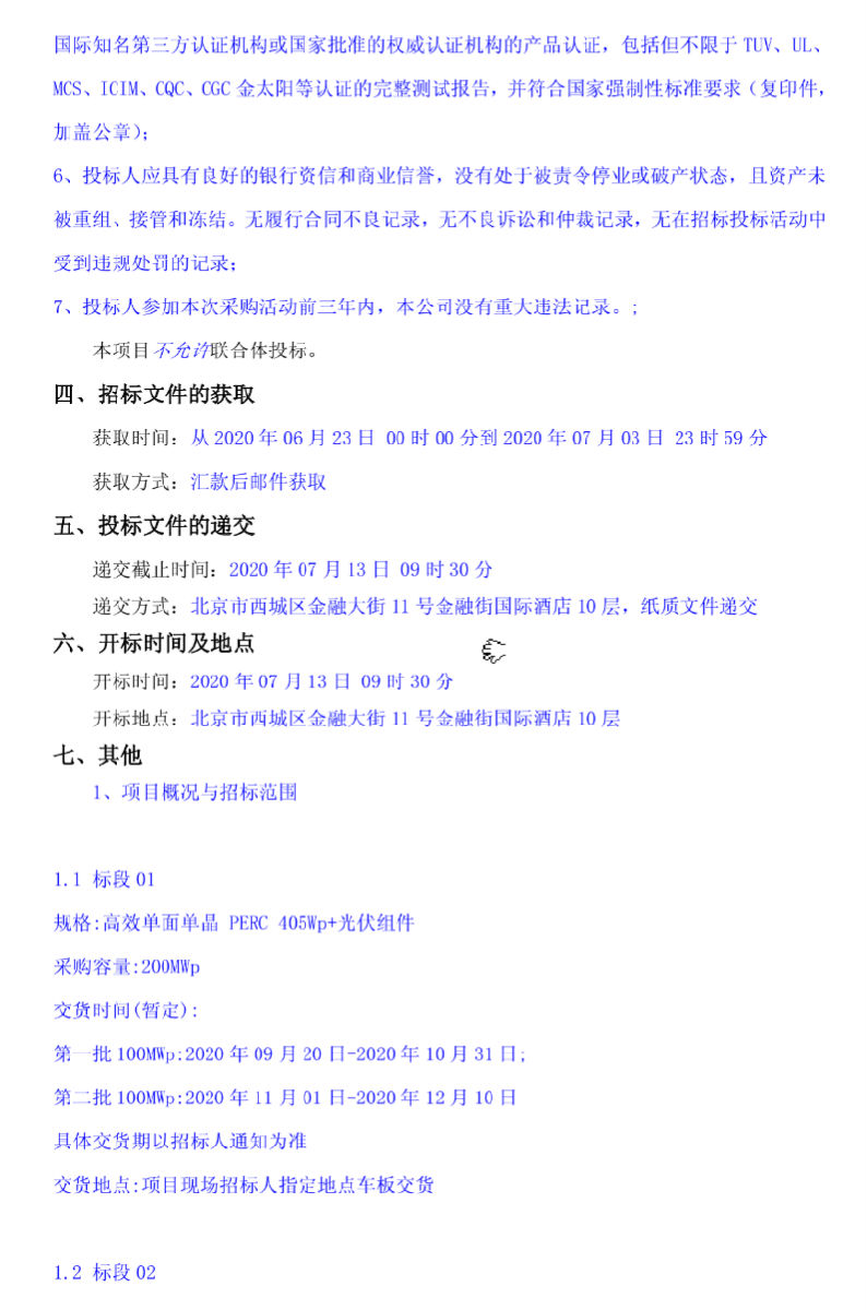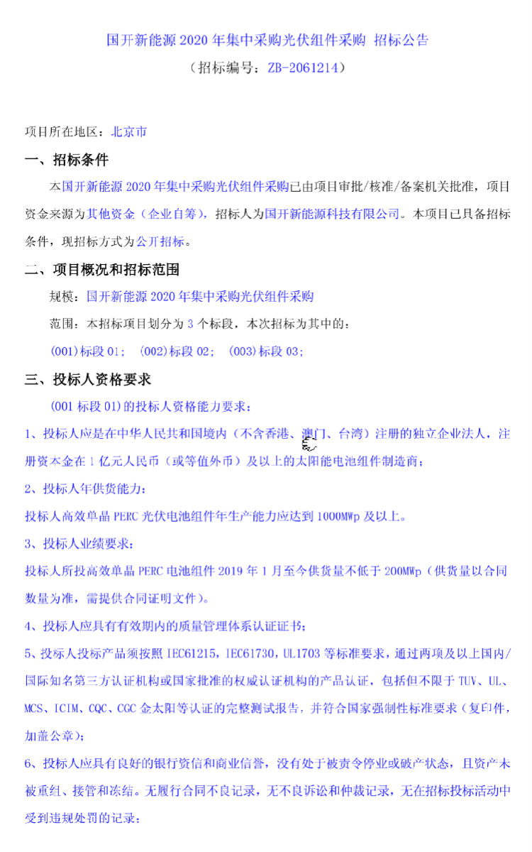 6月22日,国开新能源2020年集中采购光伏组件招标公告发布。此次招标共分为3各标段,详情如下: