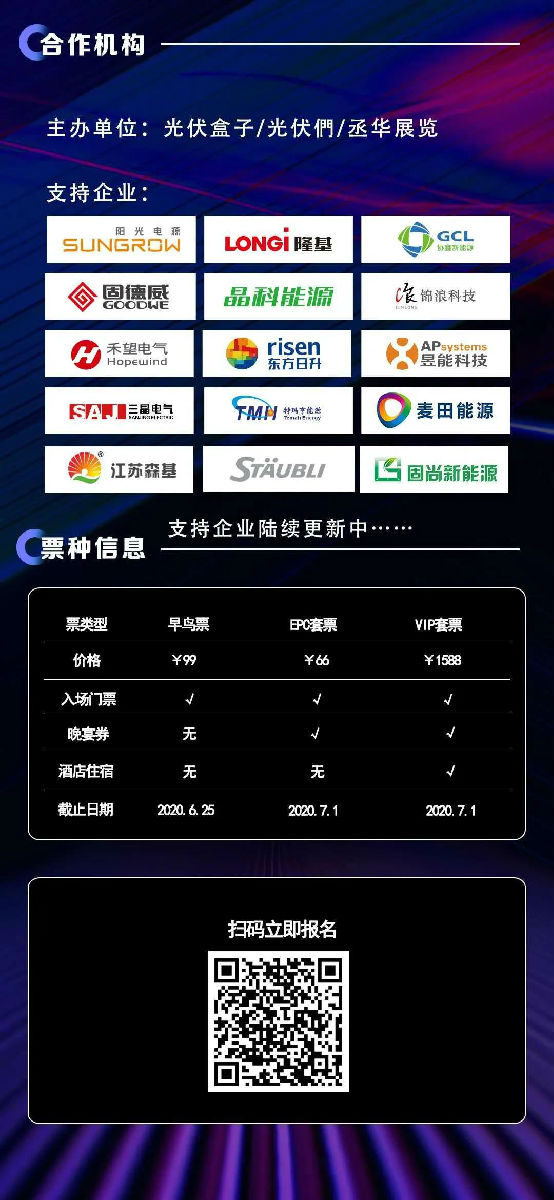 7月2日,光伏盒子联合光伏們及山东丞华展览公司,邀请部分省份的地方行业协会领导、光伏行业专家、行业权威分析师,共同分析和探讨2020年光伏行业发展情况,预测2021年行业走向。同时,大会组委会还邀请了各地市优秀光伏安装商代表和分布式光伏行业领袖企业参会,在大会同期为2019年在光伏行业做出突出贡献的企业进行颁奖,鼓励他们在2020年能再接再厉,再创辉煌。大会详细议程如下(扫码或点击文末“阅读原文”报名参会):