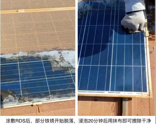近日,山东惠中新材料有限公司(简称:山东惠中)推出的RDS光伏组件环保清洁剂在清除分布式光伏电站重污染物方面取得了不俗的效果。从现场使用效果来看,RDS环保清洁剂有效的去除了光伏组件表面的铁锈、漆粉和油污,且不伤光伏组件,不污染环境,深受客户好评。