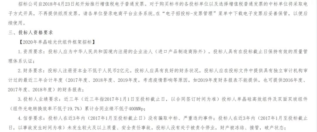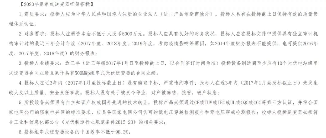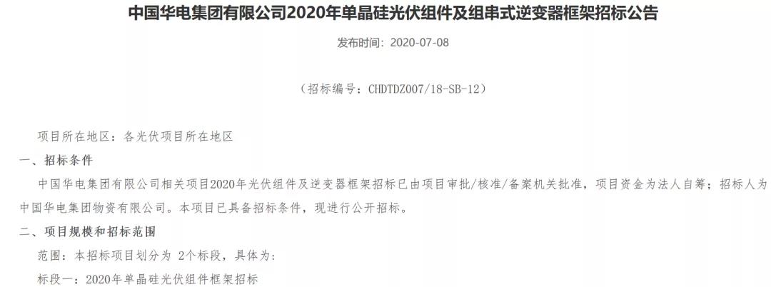 7月8日,中国华电集团有限公司(以下简称“华电”)2020年单晶硅光伏组件及组串式逆变器框架招标公告发布。