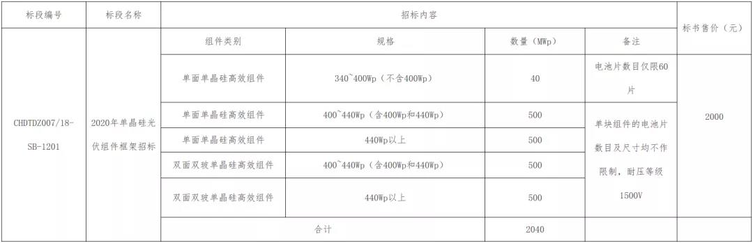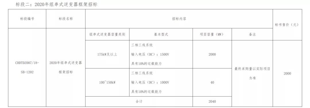 根据招标公告,本招标项目划分为2个标段:单晶硅光伏组件框架招标;组串式逆变器框架招标,详情如下: