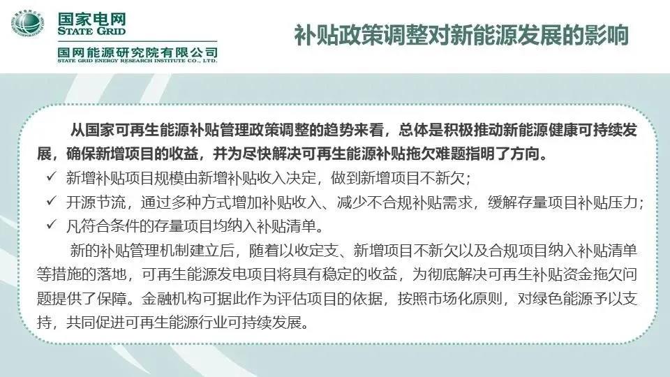 从国家可再生能源补贴管理政策调整的趋势来看,总体是积极推动新能源健康可持续发展,确保新增项目的收益,并为尽快解决可再生能源补贴拖欠难题指明了方向。