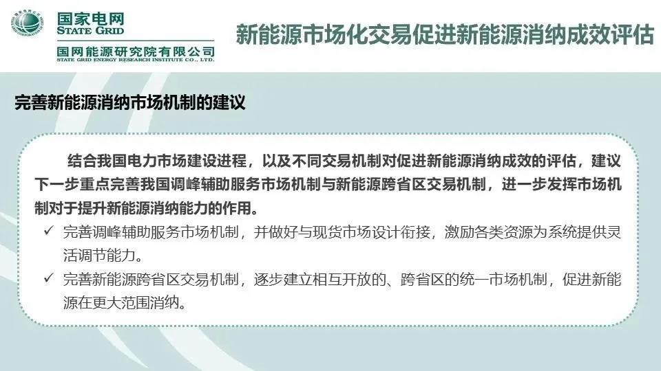 同时结合我国电力市场建设进程,以及不同交易机制对促进新能源消纳成效的评估,《报告》建议下一步重点完善我国调峰辅助服务机制与新能源跨省区交易机制,进一步发挥市场机制对于提升新能源消纳能力的作用。