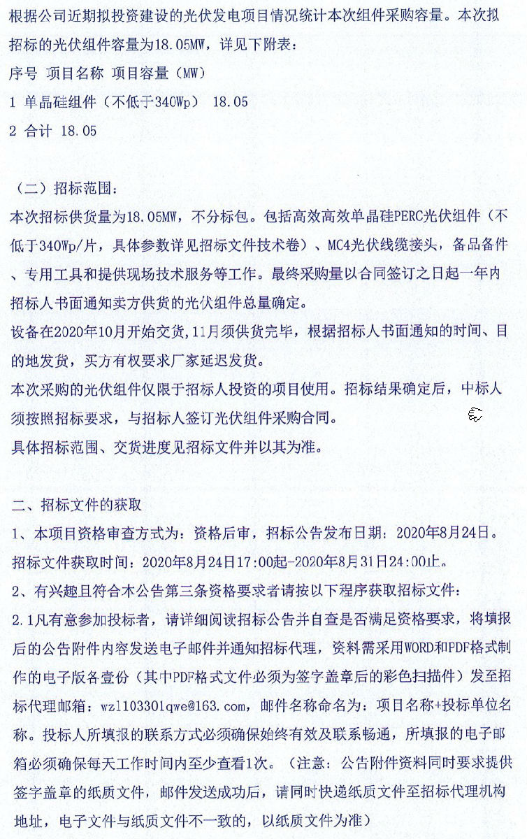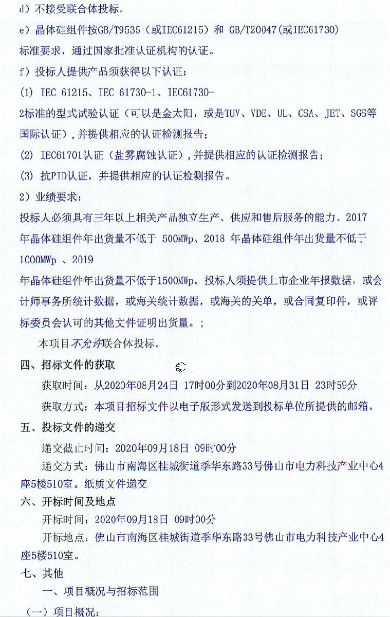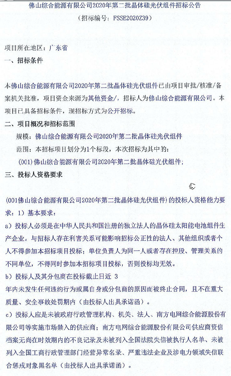 8月24日,佛山综合能源有限公司2020年第二批晶体硅光伏组件招标公告发布。