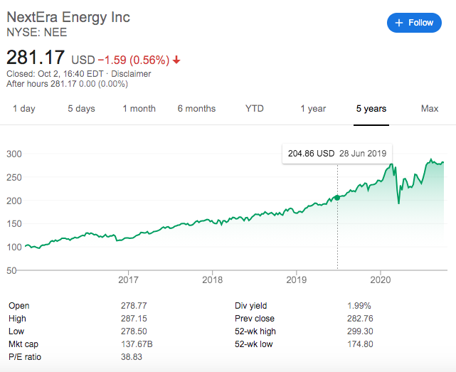 NextEra除了在美国佛罗里达州拥有电力公司之外,还拥有具有竞争力的清洁能源业务NextEra Energy Resources,这项业务以及其附属企业是美国最大的风能、太阳能可再生能源生厂商。