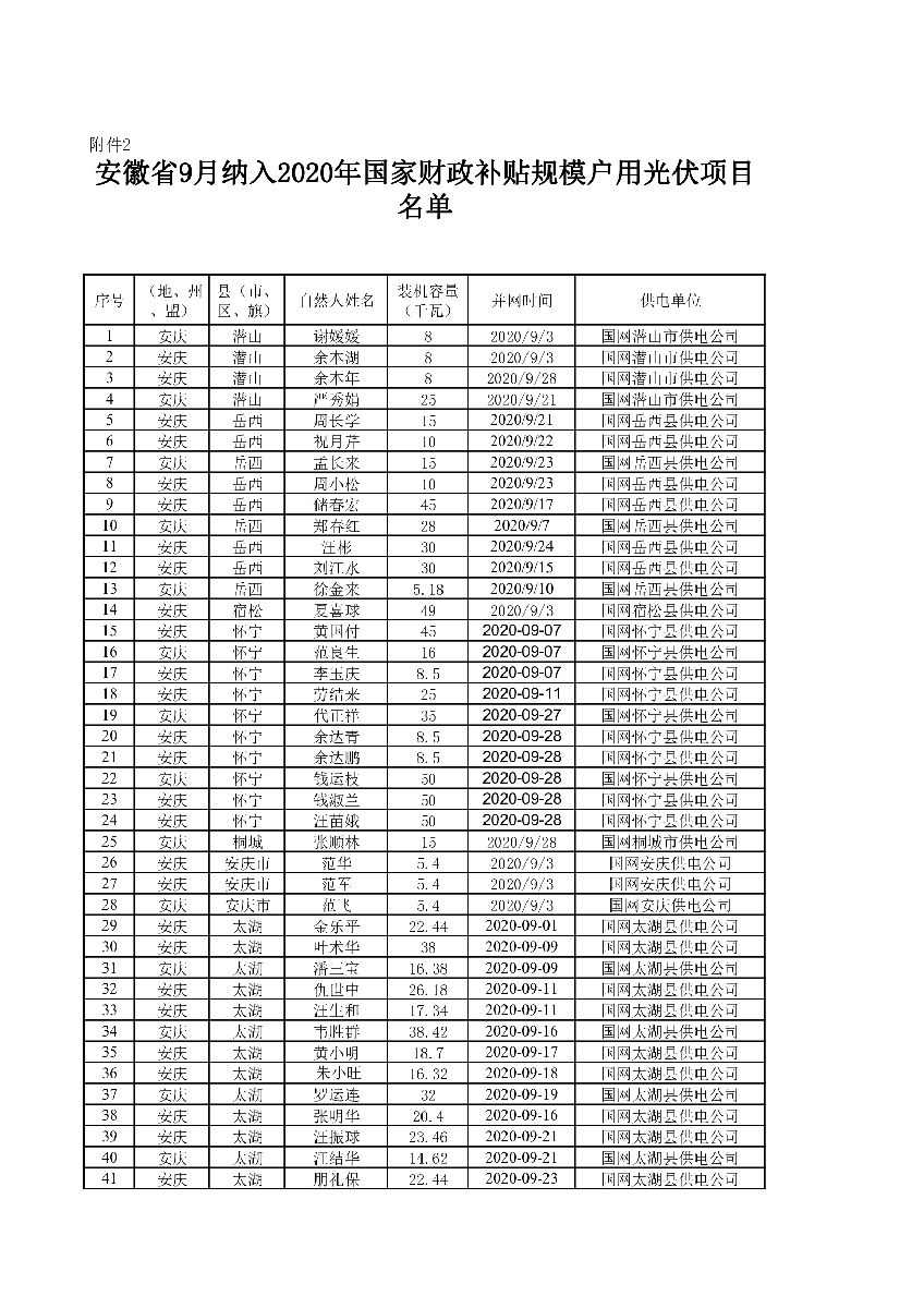 安徽省公示9月纳入财政补贴规模户用光伏项目(附全名单)