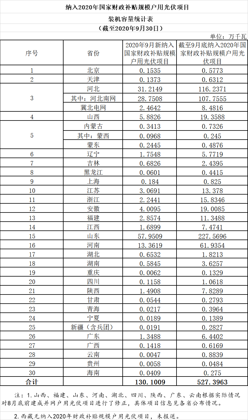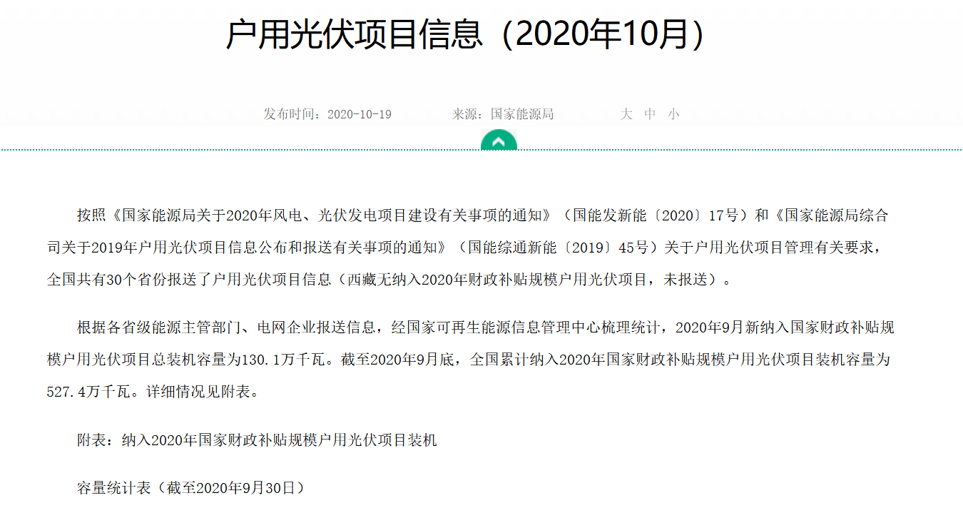 10月19日,国家能源局发布了10月份户用光伏项目信息。根据国家能源局统计数据,2020年9月新纳入国家财政补贴规模户用光伏项目总装机容量为130.1万千瓦(1.3GW)。截至2020年9月底,全国累计纳入2020年国家财政补贴规模户用光伏项目装机容量为527.4万千瓦(5.27GW)。全国共有30个省份报送了户用光伏项目信息(西藏无纳入2020年财政补贴规模户用光伏项目,未报送)。此前年初制定了6GW指标,如今户用光伏指标只剩下0.73GW。