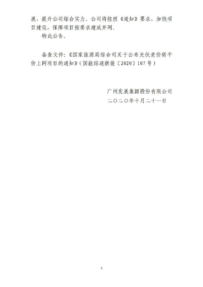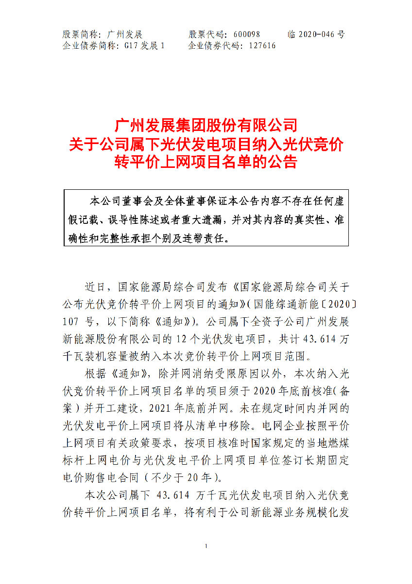 10月20日,广州发展发布公告表示,近日,国家能源局综合司发布《国家能源局综合司关于公布光伏竞价转平价上网项目的通知》。公司属下全资子公司广州发展新能源股份有限公司的12个光伏发电项目,共计43.614万千瓦装机容量被纳入本次竞价转平价上网项目范围。这将有利于公司新能源业务规模化发展,提升公司综合实力。