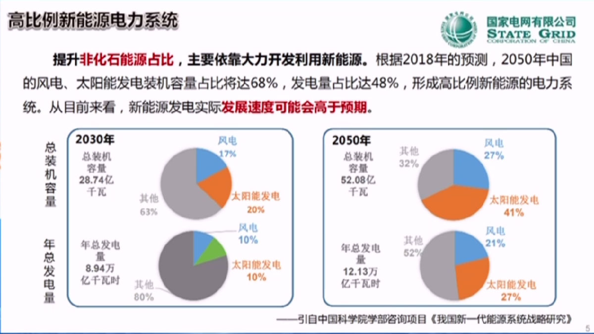 据郭剑波院士介绍,根据2018年的预测,2050年中国的风电、太阳能发电装机容量占比将达68%,发电量占比达48%,形成高比例新能源的电力系统。从目前发展情况和预期来看,新能源发电实际发展速度可能会高于预期。