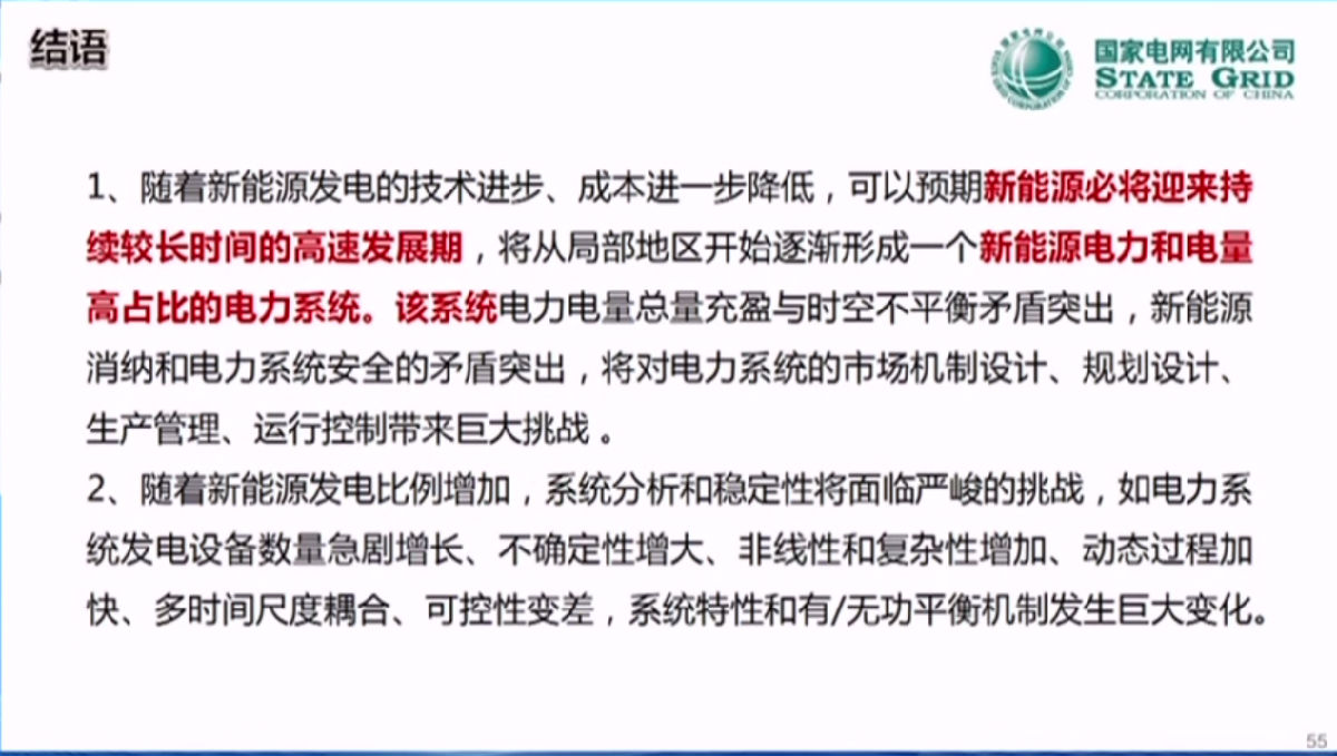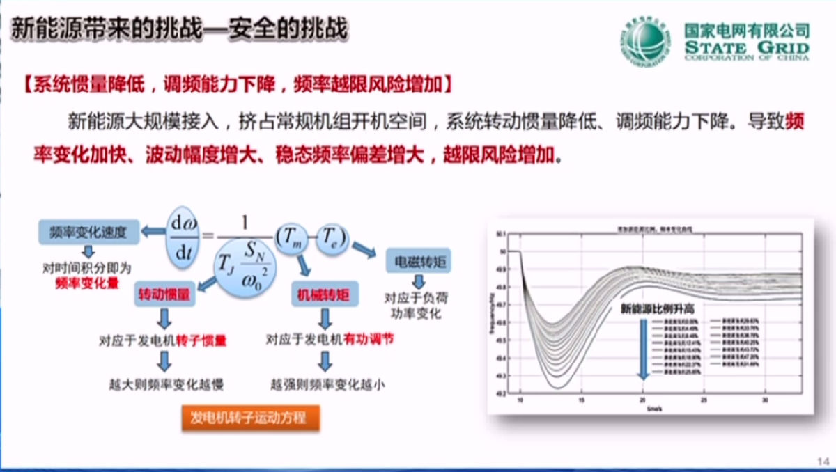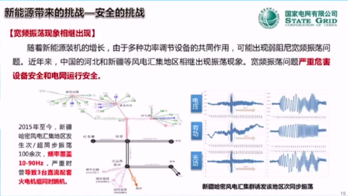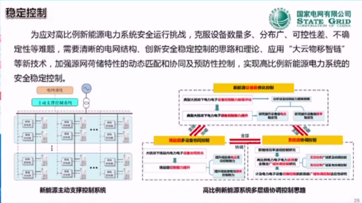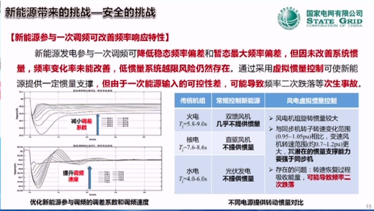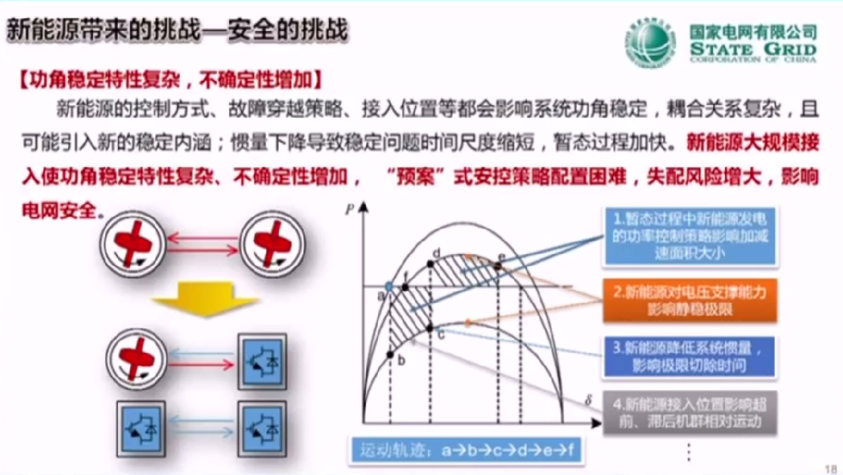 在新能源供电带来的安全问题方面,郭剑波院士指出,新能源发电参与一次调频可降低稳态频率偏差和暂态最大频率偏差,但因未改善系统惯量,频率变化率未能改善,低惯量系统越限风险仍然存在。通过采用虚拟惯量控制可使新能源提供一定惯量支撑,但由于一次能源输入的可控性差,可能导致频率二次跌落等次生事故。另外,新能源大规模接入会导致频率越限风险增加、系统电压稳定问题突出、高占比地区暂态过电压严重、功角稳定特性复杂、“预案”式安控策略配置困难、宽频震荡现象相继出现、调控运行复杂等挑战。