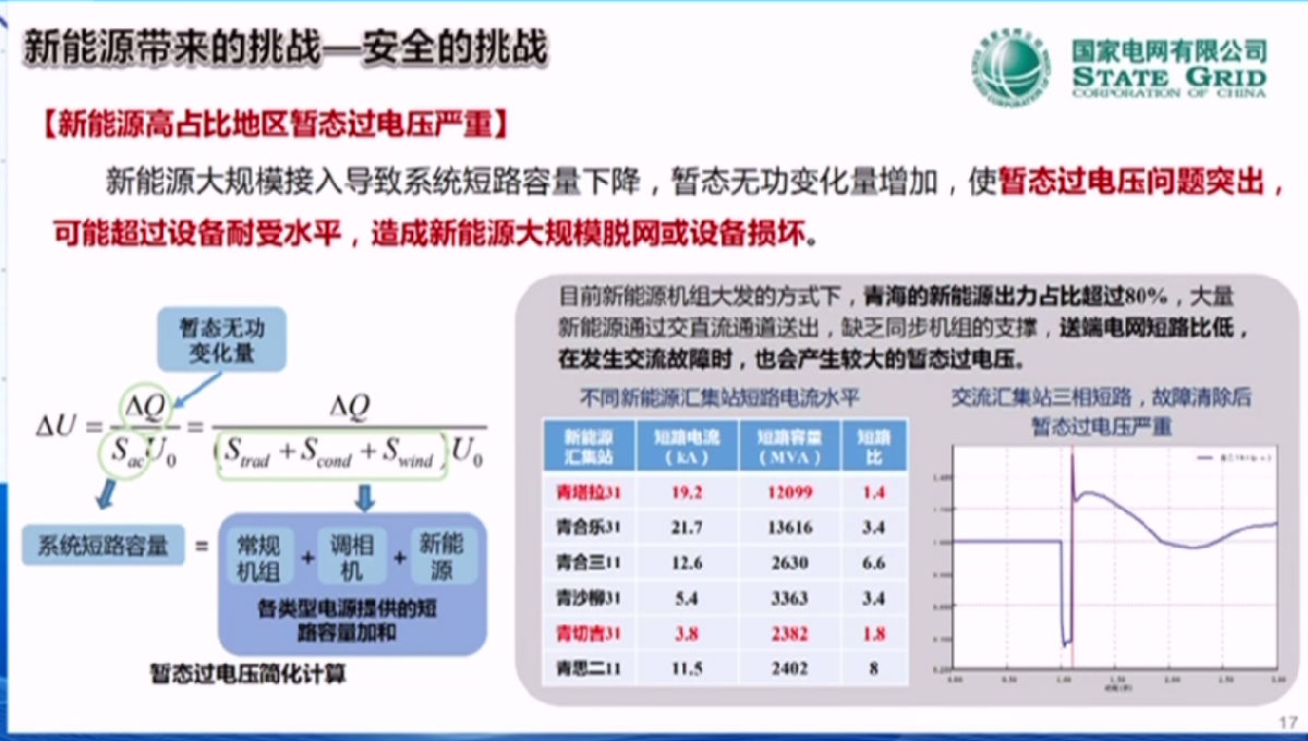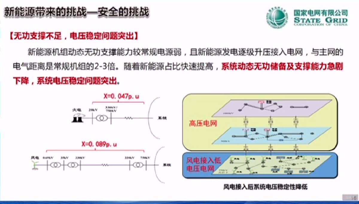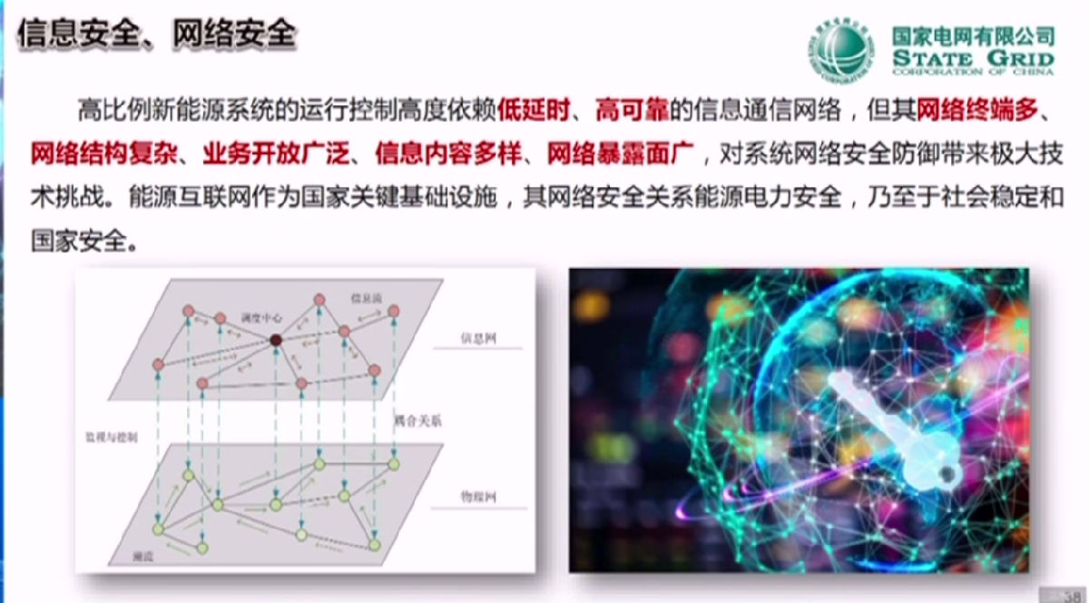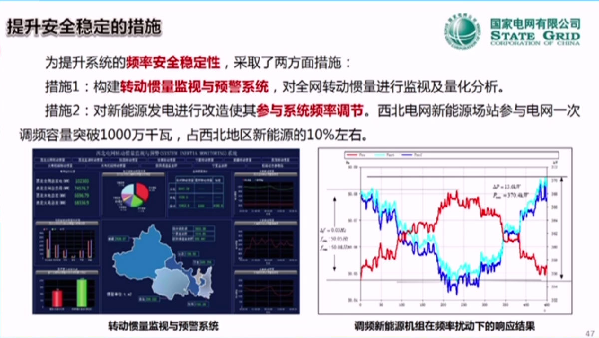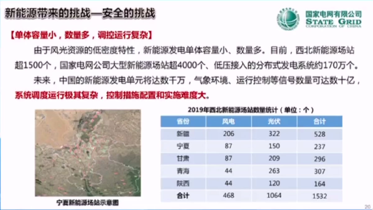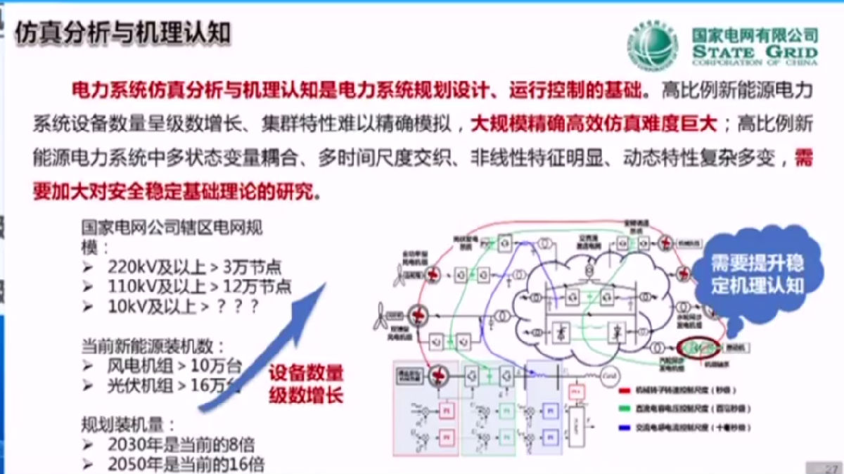 在新能源供电带来的安全问题方面,郭剑波院士指出,新能源发电参与一次调频可降低稳态频率偏差和暂态最大频率偏差,但因未改善系统惯量,频率变化率未能改善,低惯量系统越限风险仍然存在。通过采用虚拟惯量控制可使新能源提供一定惯量支撑,但由于一次能源输入的可控性差,可能导致频率二次跌落等次生事故。另外,新能源大规模接入会导致频率越限风险增加、系统电压稳定问题突出、高占比地区暂态过电压严重、功角稳定特性复杂、“预案”式安控策略配置困难、宽频震荡现象相继出现、调控运行复杂等挑战。