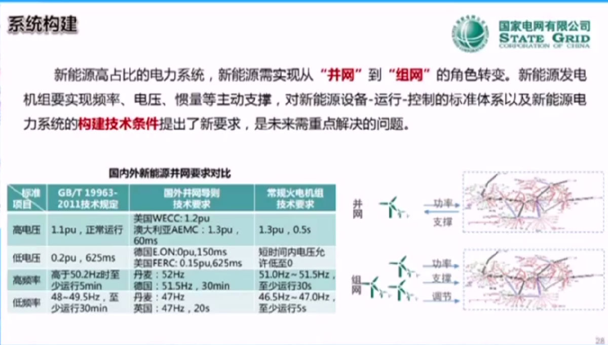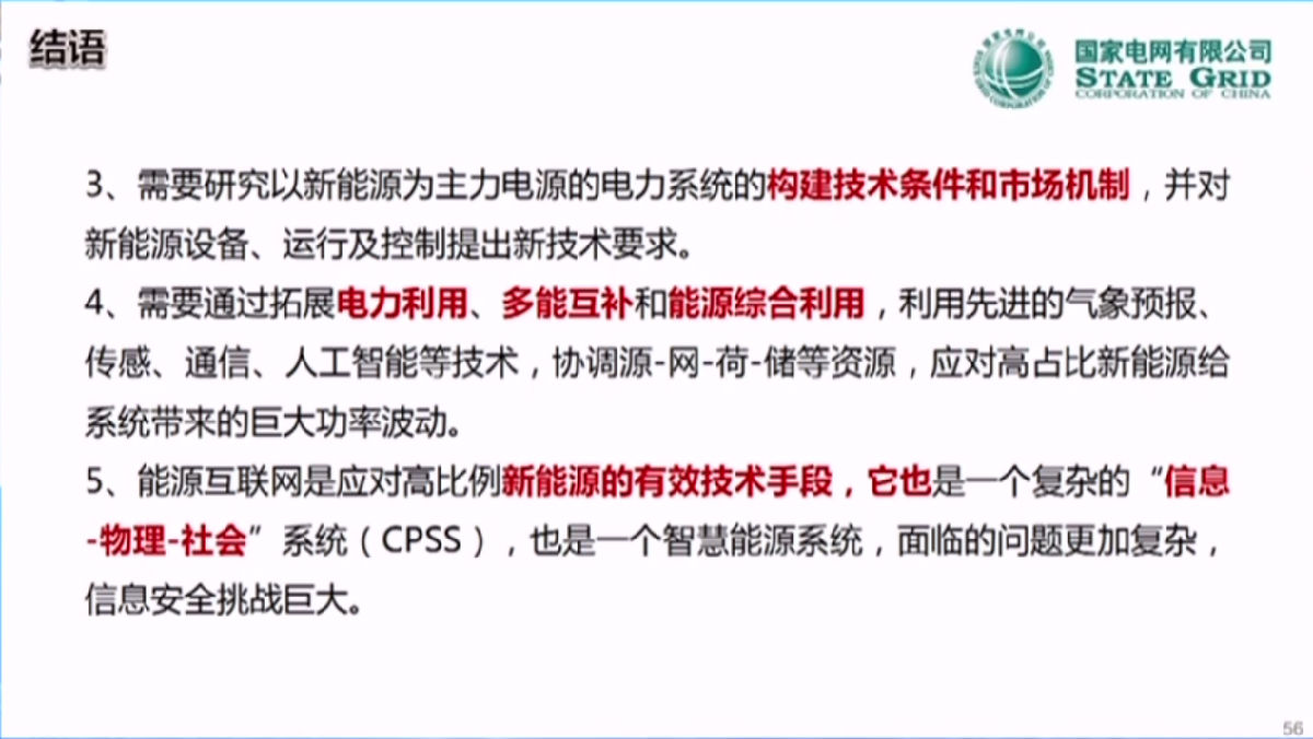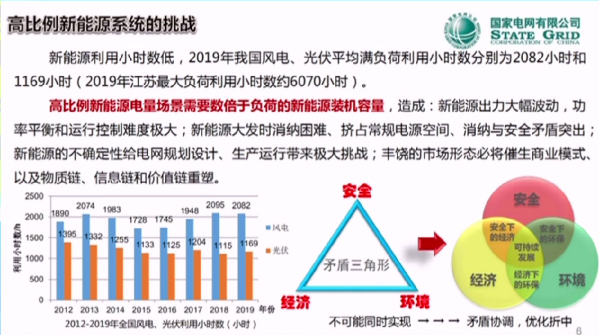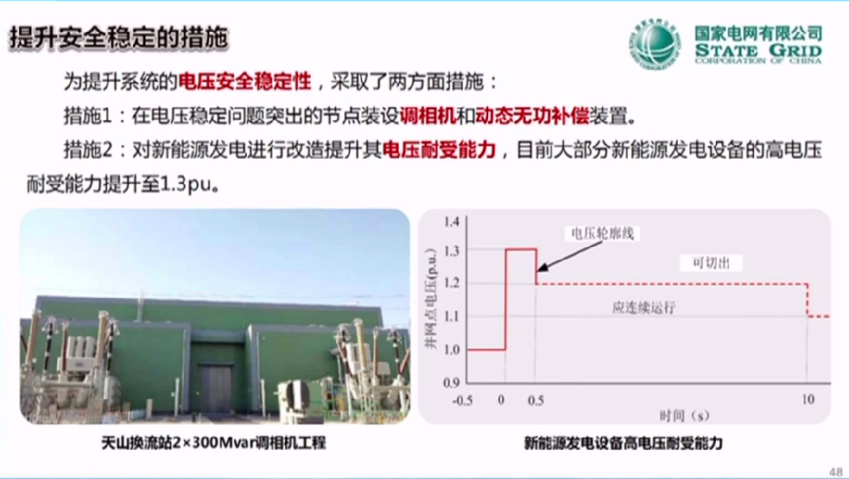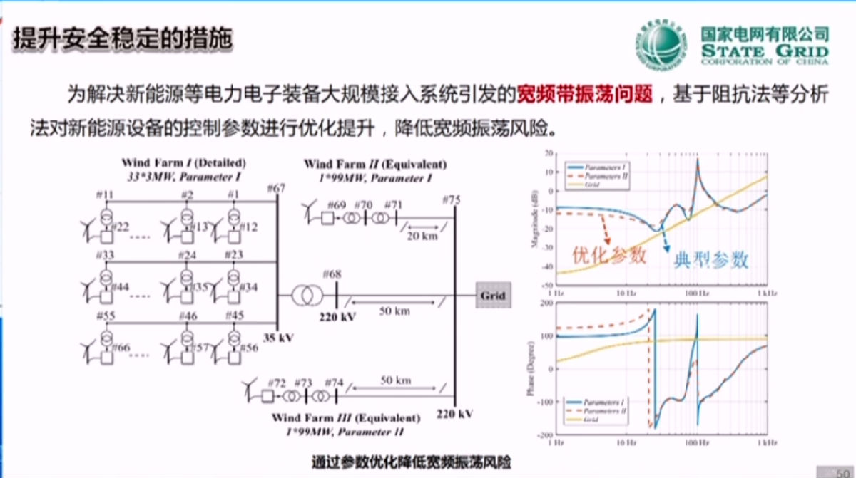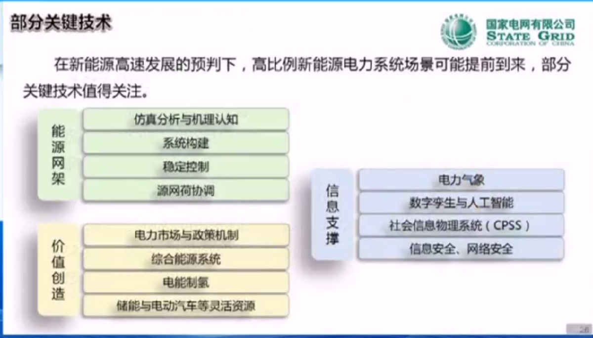 在新能源供电带来的安全问题方面,郭剑波院士指出,新能源发电参与一次调频可降低稳态频率偏差和暂态最大频率偏差,但因未改善系统惯量,频率变化率未能改善,低惯量系统越限风险仍然存在。通过采用虚拟惯量控制可使新能源提供一定惯量支撑,但由于一次能源输入的可控性差,可能导致频率二次跌落等次生事故。另外,新能源大规模接入会导致频率越限风险增加、系统电压稳定问题突出、高占比地区暂态过电压严重、功角稳定特性复杂、“预案”式安控策略配置困难、宽频震荡现象相继出现、调控运行复杂等挑战。