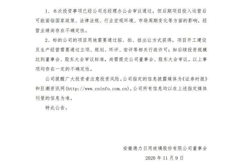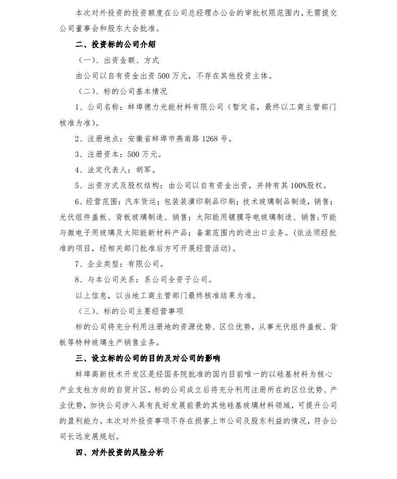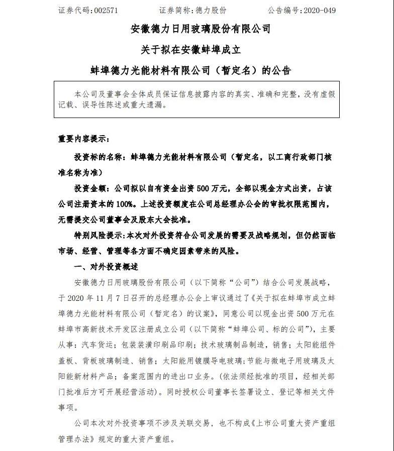 11月9日,德力股份发布公告,结合公司发展战略,于 2020 年11 月7日召开的总经理办公会上审议通过了《关于拟在蚌埠市成立蚌埠德力光能材料有限公司(暂定名)的议案》,同意公司以现金出资500万元在蚌埠市高新技术开发区注册成立公司(以下简称“蚌埠公司、标的公司”)。