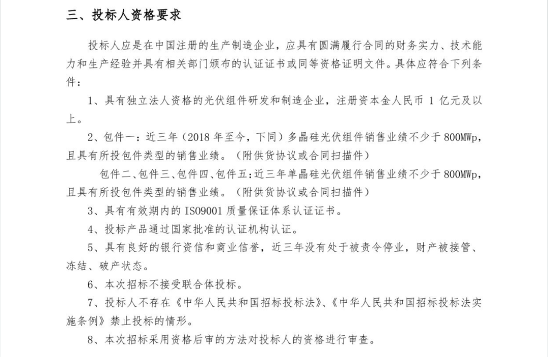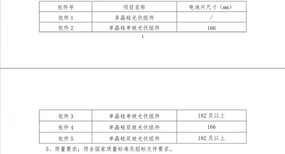 根据招标公告,本次组件采购中,共分5个包件,其中包件1为多晶组件外,其它4个包件均为单晶组件。值得注意的是,在单晶组件包件中,中国电建明确列出了电池尺寸要求,包件2和包件4组件电池要求为166,包件4和包件5则要求电池尺寸为182及以上。