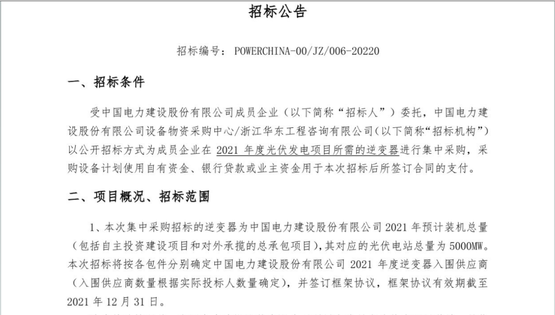 中国电建股份公司2021年度光伏逆变器集中采购项目招标公告