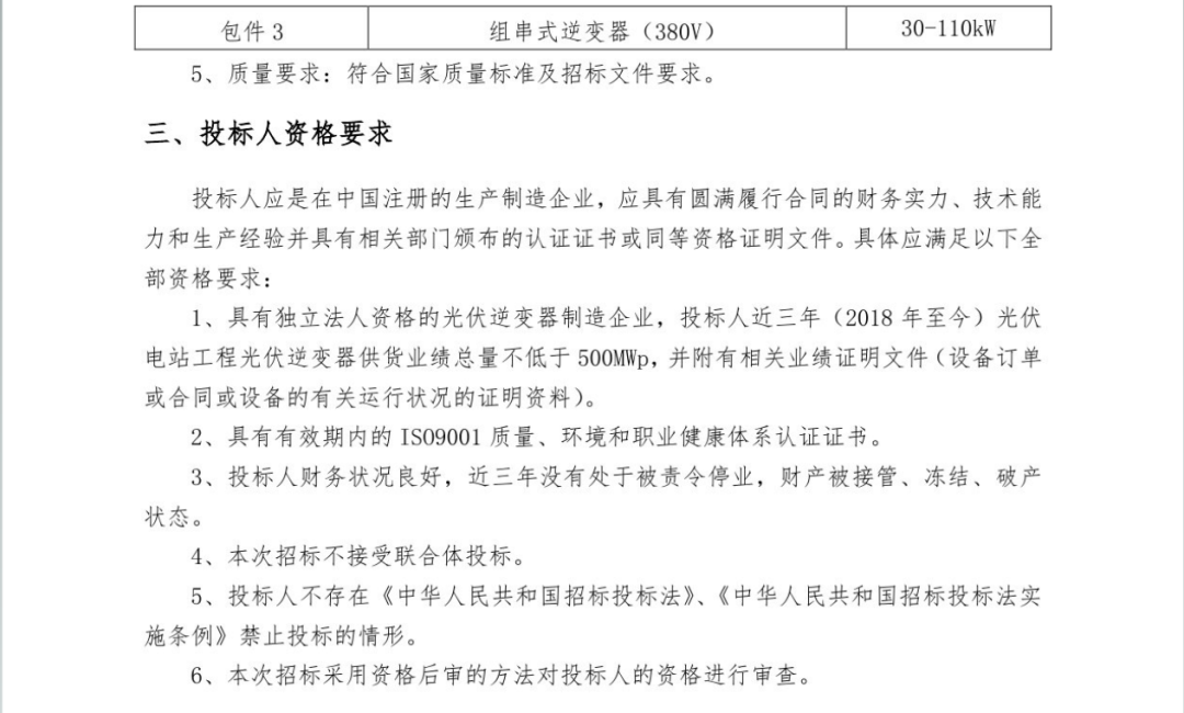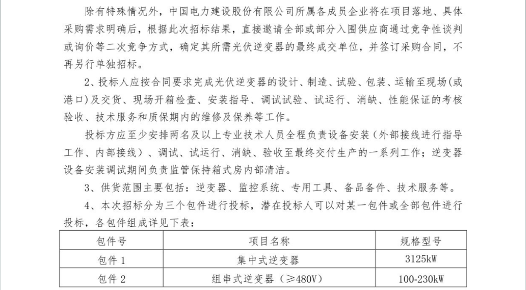 此外,本次逆变器采购,共有三个包件,分别为1个集中式逆变器包件和2个组串逆变器包件。集中式逆变器要求规格为3125kW,组串逆变器规格要求分为30~110kW和100~230kW。