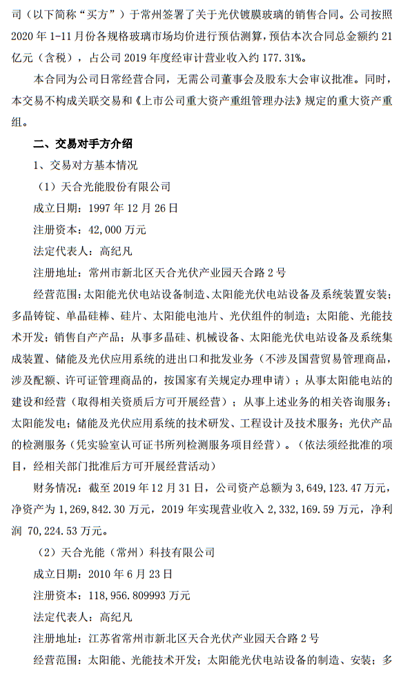11月15日,常州亚玛顿股份有限公司(下称“亚玛顿”)发布《关于签订日常经营重大销售合同的公告》(以下简称“《公告》”),指出,11月15日,公司与天合光能股份有限公司、天合光能(常州)科技有限公司、盐城天合国能光伏科技有限公司、常州天合亚邦光能有限公司、合肥天合光能科技有限公司、常州天合合众光电有限公司、天合光能(宿迁)科技有限公司、天合光能(义乌)科技有限公司、天合光能(常州)光电设备有限公司(以下简称“买方”)于常州签署了关于光伏镀膜玻璃的销售合同。公司按照2020年1-11月份各规格玻璃市场均价进行预估测算,预估本次合同总金额约21亿元(含税),占公司2019年度经审计营业收入约177.31%。