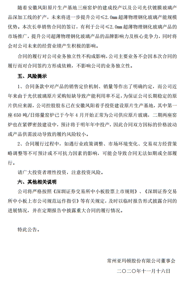 对于该合同对亚玛顿的影响,《公告》指出,随着安徽凤阳原片生产基地三座窑炉的建成投产以及公司光伏镀膜玻璃产品深加工线的扩产,未来将进一步提升公司≤2.0mm超薄物理钢化玻璃产能规模优势。本次长单销售合同的签订,有利于亚玛顿≤2.0mm超薄物理钢化玻璃产品的市场推广,提升亚玛顿超薄物理钢化玻璃产品的品牌影响力及核心竞争力,同时将会对公司未来的经营业绩产生积极的影响。
