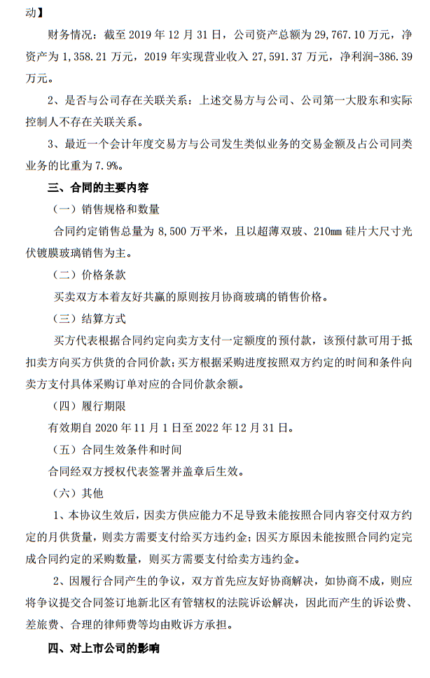 《公告》表示,合同的主要内容为,销售总量为8,500万平米,且以超薄双玻、210mm硅片大尺寸光伏镀膜玻璃销售为主。合同经双方授权代表签署并盖章后生效。生效后,因卖方供应能力不足导致未能按照合同内容交付双方约定的月供货量,则卖方需要支付给买方违约金;因买方原因未能按照合同约定完成合同约定的采购数量,则买方需要支付给卖方违约金。