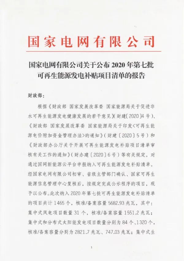 关于公布2020年第七批可再生能源发电补贴项目清单的公告