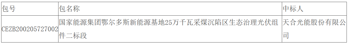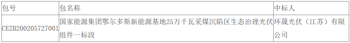11月18日,国家能源集团圣圆能源鄂尔多斯新能源基地天骄绿能25万千瓦釆煤沉陷区生态治理光伏组件采购公开招标中标结果公示。环晟光伏、天合光能分别中标第一、第二标段。