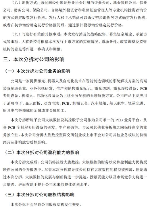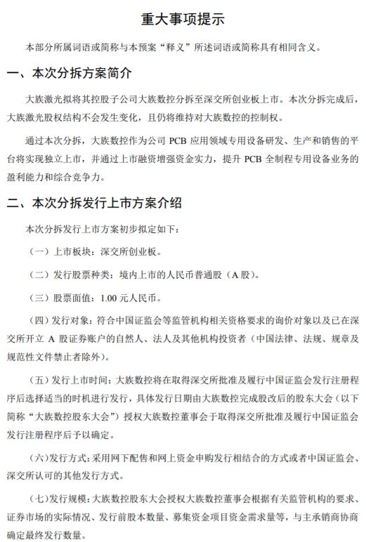 大族激光在公告中表示,目前该分拆方案仍需公司股东大会审议通过并取得监管层的批准,发行规模、发行时间和定价方式均未确定。