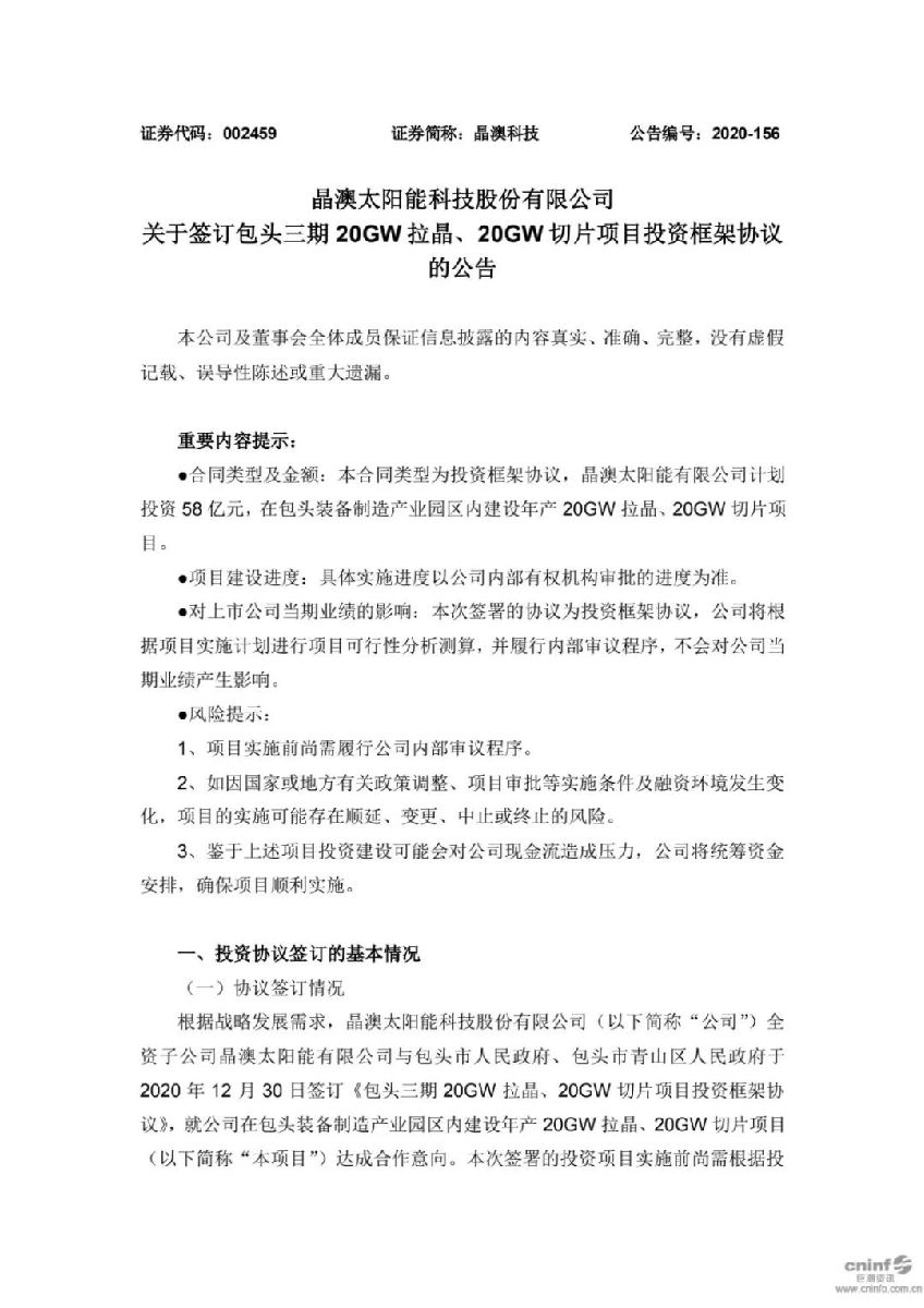 12月30日,晶澳太阳能有限公司与包头市政府、青山区政府签订晶澳包头基地(三期)20GW拉晶和20GW切片项目框架协议。晶澳科技董事、执行总裁牛新伟博士出席仪式并代表晶澳签约。