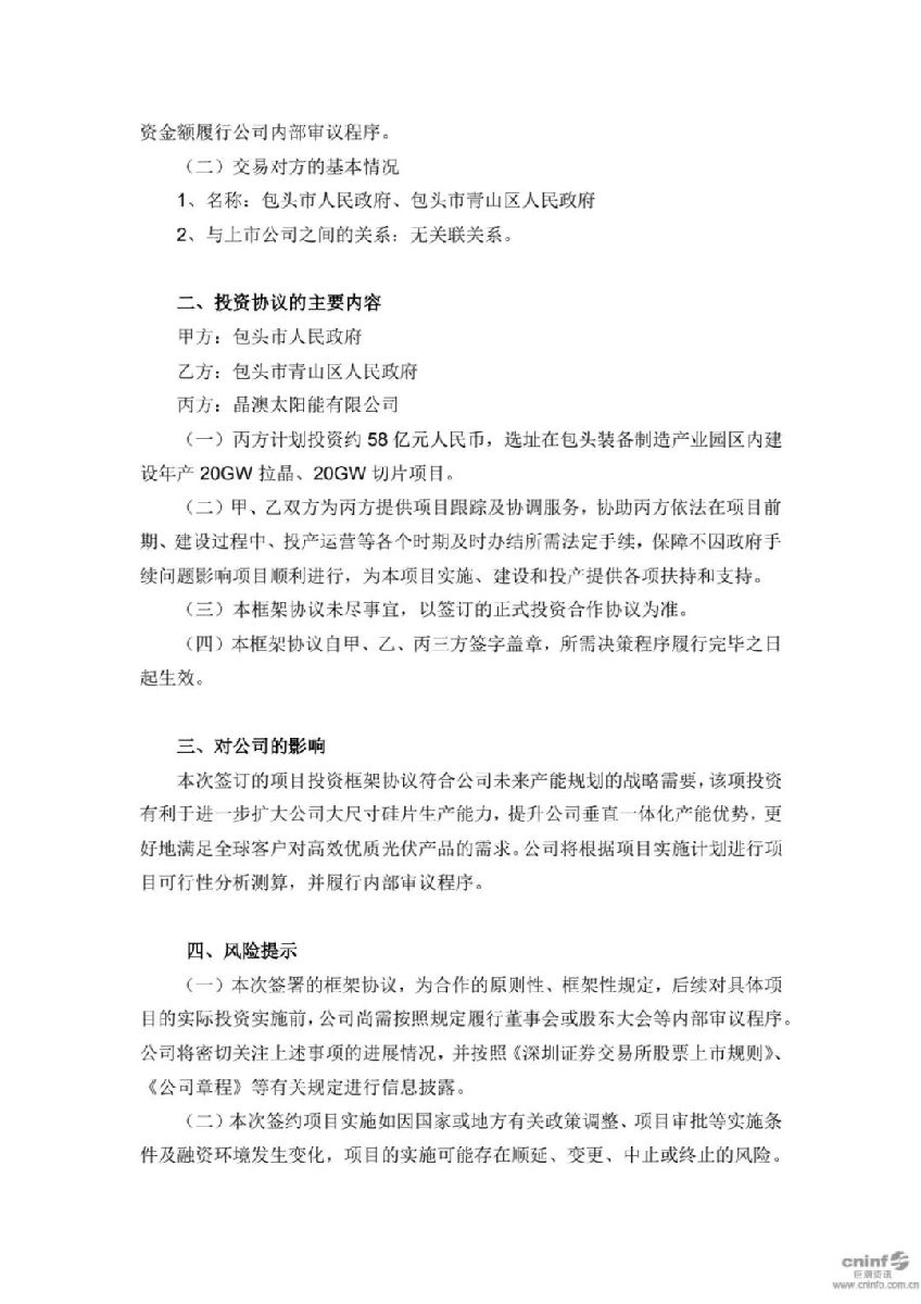根据协议,晶澳将在包头装备制造产业园区内投资58亿元,建设包头基地(三期)20GW拉晶和20GW切片项目。该项目将进一步发挥包头当地的资源优势,提升晶澳大尺寸硅片生产能力,加强晶澳垂直一体化产能优势,更好地满足全球客户对高效优质光伏产品的需求。