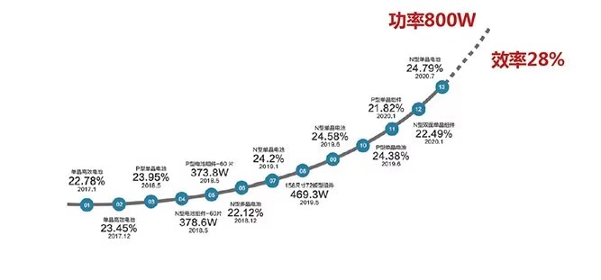 15次打破电池效率和组件功率世界记录,保持24.9%电池效率记录。量产组件功率550W+,组件效率22%。