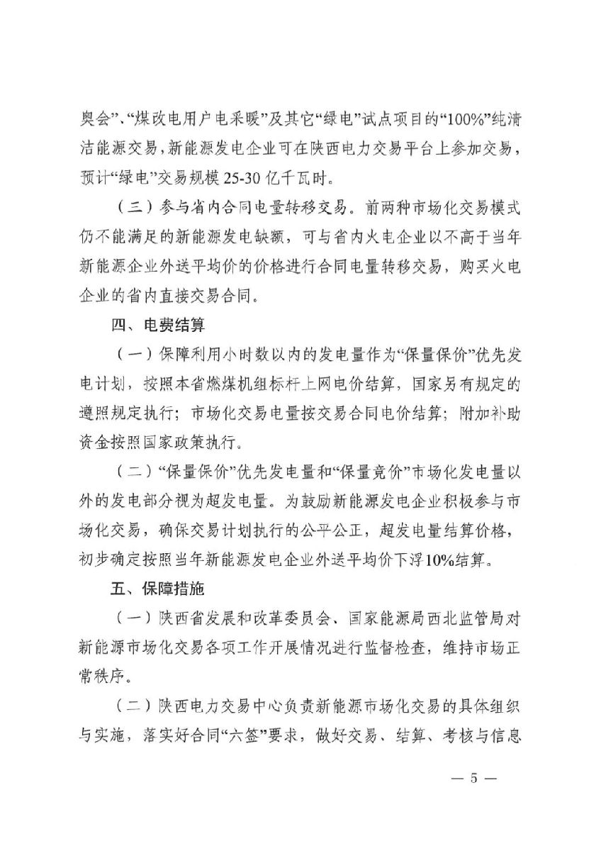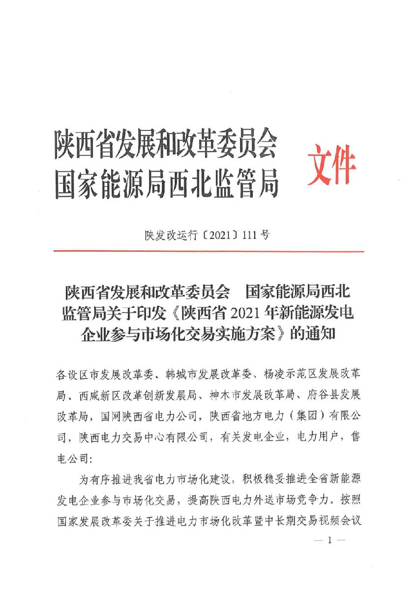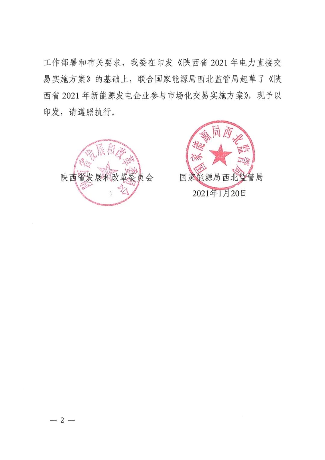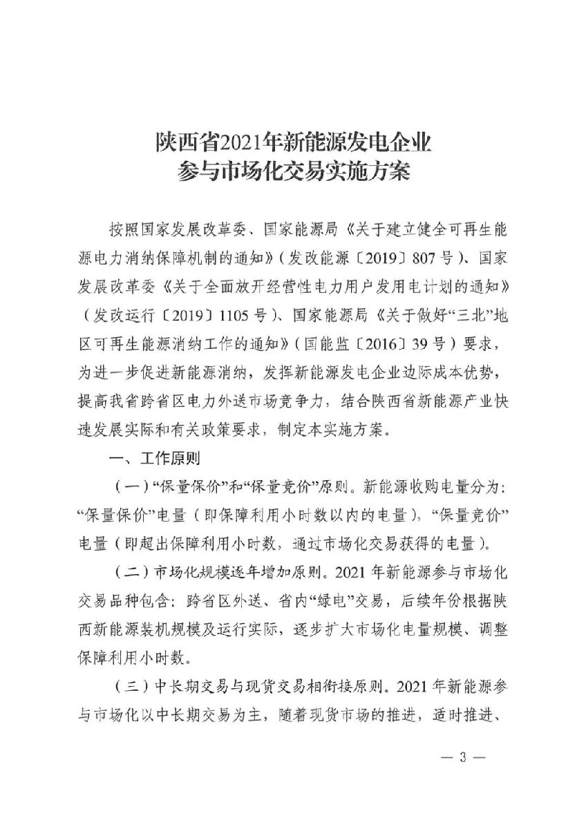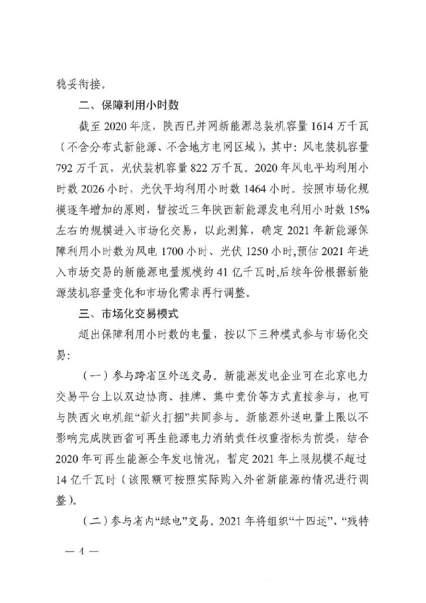 1月20日,陕西发改委、国家能源局西北监管局印发《陕西省2021年新能源发电企业参与市场化交易实施方案》,要求新能源企业按照近三年平均发电小时数的15%参与市场交易(保量竞价部分),而“保量保价”部分即光伏、风电保障利用小时数分别降至1250小时、1700小时;上述两部分之外的电量视为超发电量,即在保障小时数以及市场交易电量之外的发电量部分,按当年新能源发电企业外送平均价格的10%进行下浮,再由电网进行收购。